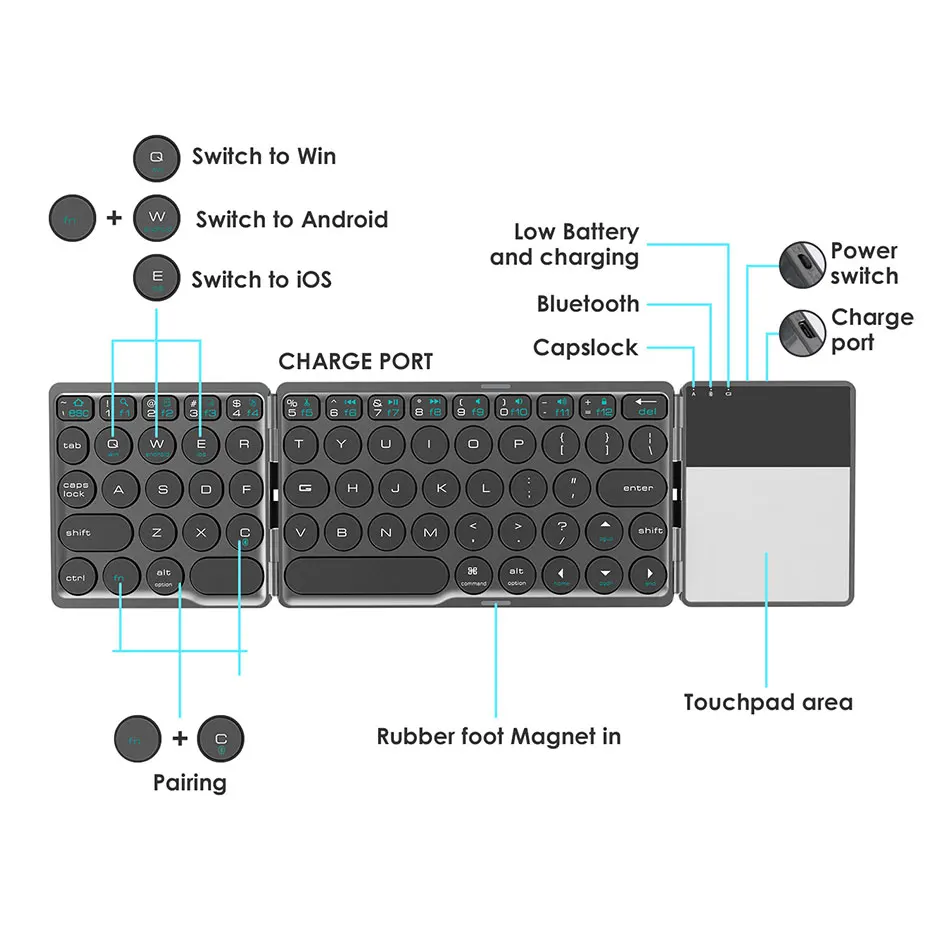 - 【Размер кармана и простота использования 】Всего 260 г пальмового размера клавиатуры можно сложить в карман или рюкзак, чтобы носить с собой. Просто нажмите кнопку подключения, чтобы быстро соединить устройство. Автоматическое включение/выключение и повторное подключение делают работу более удобной.