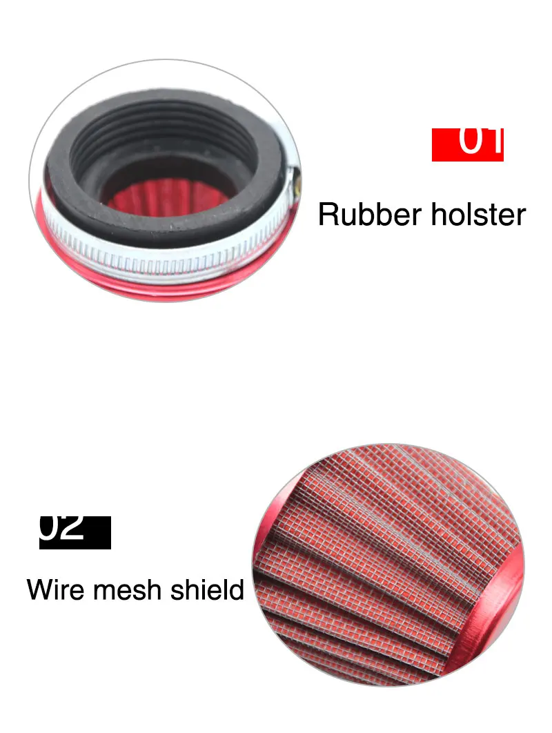 1. Воздушный фильтр предотвращает попадание абразивных твердых частиц в двигатель; Цилиндры в конечном итоге увеличивают мощность лошадиных сил, крутящий момент и улучшают пробег газа.2. Изготовлен из высококачественных материалов, воздушный фильтр долговечен в использовании в течение длительного времени.3. Поставляется с зажимом и плавными резиновые переходники для удобства использования и регулировки.4. Легко помещается, может быть надежно закреплен на трубе вашего автомобиля, и вы можете настроить размер, необходимый с помощью отвертки с плоской головкой.5. Подходит для большинства внедорожных мотоциклов ATV Quad Dirt Pit Bike.Характеристики:Материал: металл, ткань, пластикЦвет: красный, синий, черный, золотой, серебряный, зеленый (по желанию)Диаметр впуска: прибл. 55 мм/2,16 дюймаРазмер фильтра (H x Dia.): прибл. 60 мм x 80 ммВес: прибл. 95 гУстановка: подходит для большинства внедорожных мотоциклов ATV Quad Dirt Pit Bike.(Пожалуйста, проверьте размеры перед заказом, чтобы узнать, подходит ли он для вашего автомобиля.)Посылка включает в себя:1 x Воздушный фильтр с зажимомПримечание:Простота установки, но настоятельно рекомендуется Профессиональная установка.