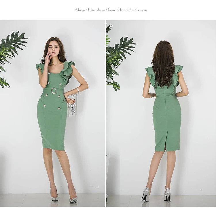Женское офисное платье без рукавов с оборками, элегантное облегающее платье с квадратным воротником на молнии сзади, летнее платье с разрезом сбоку, 2019