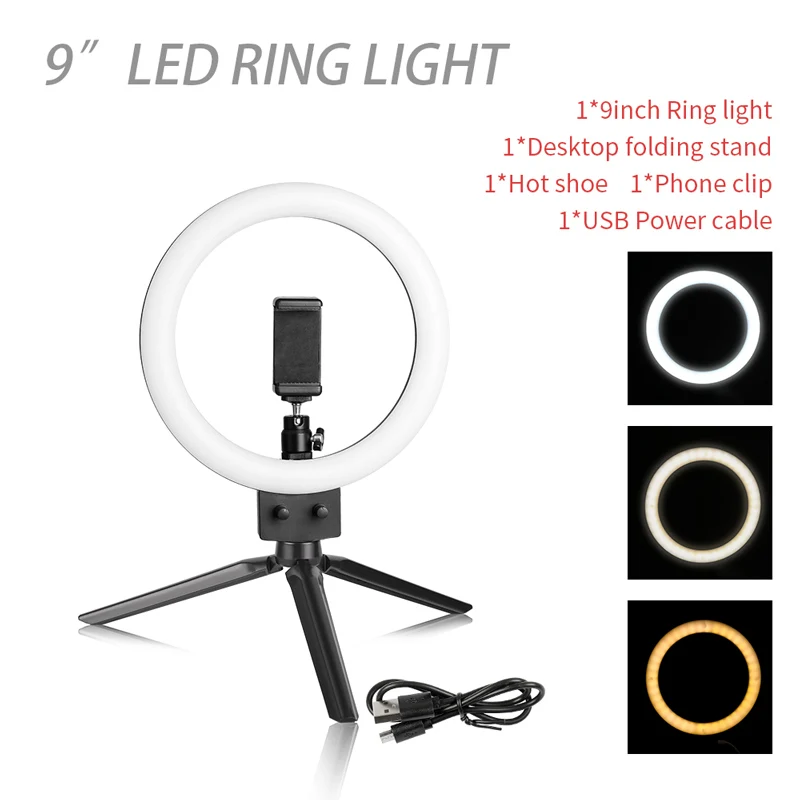 1*9 дюймов кольцевой светильник 1 * Настольная Складная подставка 1 * горячий башмак 1 * зажим для телефона 1 * USB кабель питания