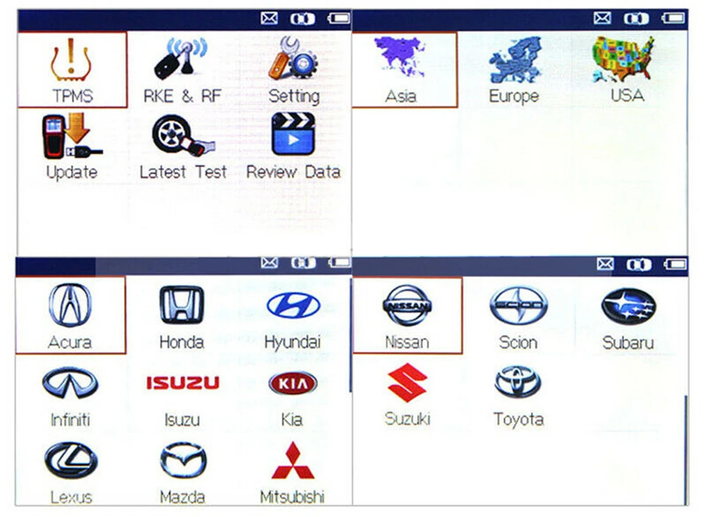 1. Программы ECU транспортного средства для изучения идентификаторов датчика и положения 2. Активирует магнитные, Частотные и дефляционные датчики с использованием 125 кГц непрерывных или модулированных волновых сигналов 3. Принимает сигналы 315 МГц, 433 МГц и 309 МГц 4. Считывает идентификатор датчика от транспортного средства ECU 5. Считывает/очищает коды Системы TPMS и сбрасывает индикатор неисправности светильник 6. Упрощает диагностический процесс, включая четыре и пять колес. 7. Транспортные средства, показывая графики транспортных средств 8. Декодирует данные датчика и обеспечивает визуальное и звуковое 9. Ответы на подтверждение правильности работы датчиков 10. Интерпретирует данные, включая идентификатор датчика, давление в шинах, температуру, 11. Состояние батареи и номер детали OE. 12. Процесс предварительного выбора обеспечивает более быструю активацию и диагностику