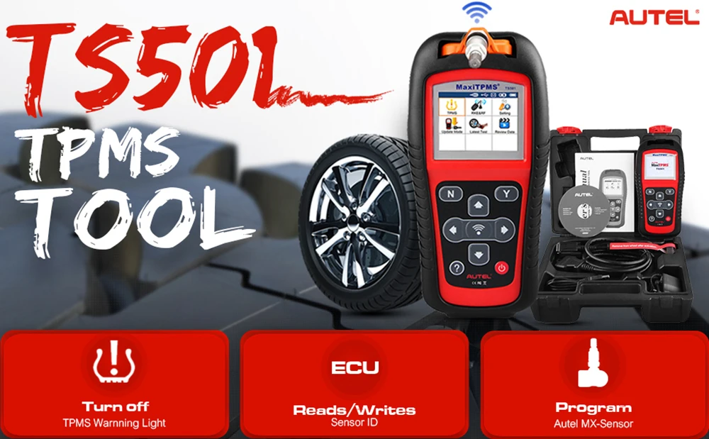 MaxiTPMS TS501 способен беспроводно диагностировать проблемы TPMS, а также активировать любые известные OEM/Универсальные датчики TPMS, идентификационные Клон или перепрограммируемые датчики на ECU транспортного средства и выключить предупреждающие огни.