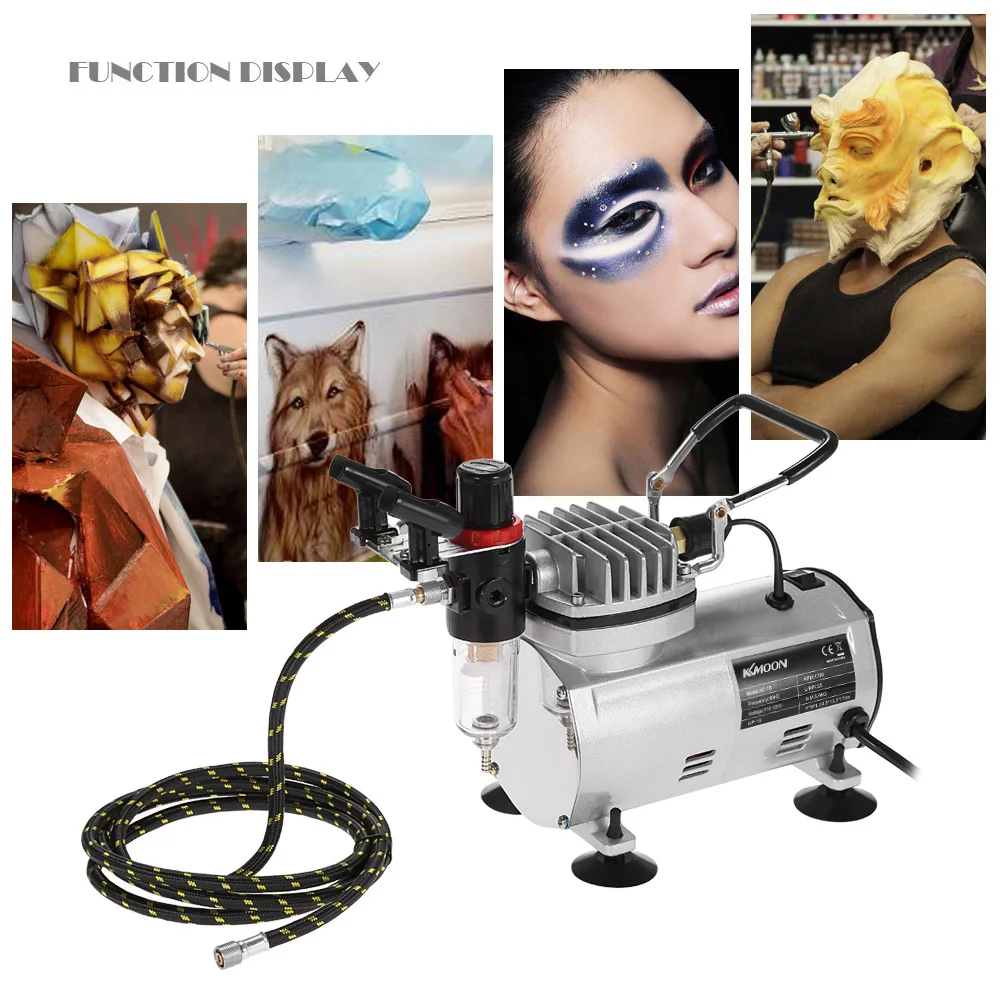 Новый фирменный комплект аэрографа KKmoon, комплект с 3 воздушными кистями и высокопроизводительным воздушным компрессором! Идеально подходит для аэрозольной живописи, а также для ногтей и временных татуировок, украшения тортов, рукоделия, увлечений, коммерческого искусства, иллюстраций, ретуширования фотографий и других видов аэрофотосъемки. Этот высокопроизводительный Компрессор предназначен для пользователей, которым необходим высококачественный эффект распыления. Используйте этот набор воздушных насосов для компрессора аэрографа, вы можете получить от новичка, чтобы стать современным художником. Поэтому не сомневайтесь, просто верните его домой!