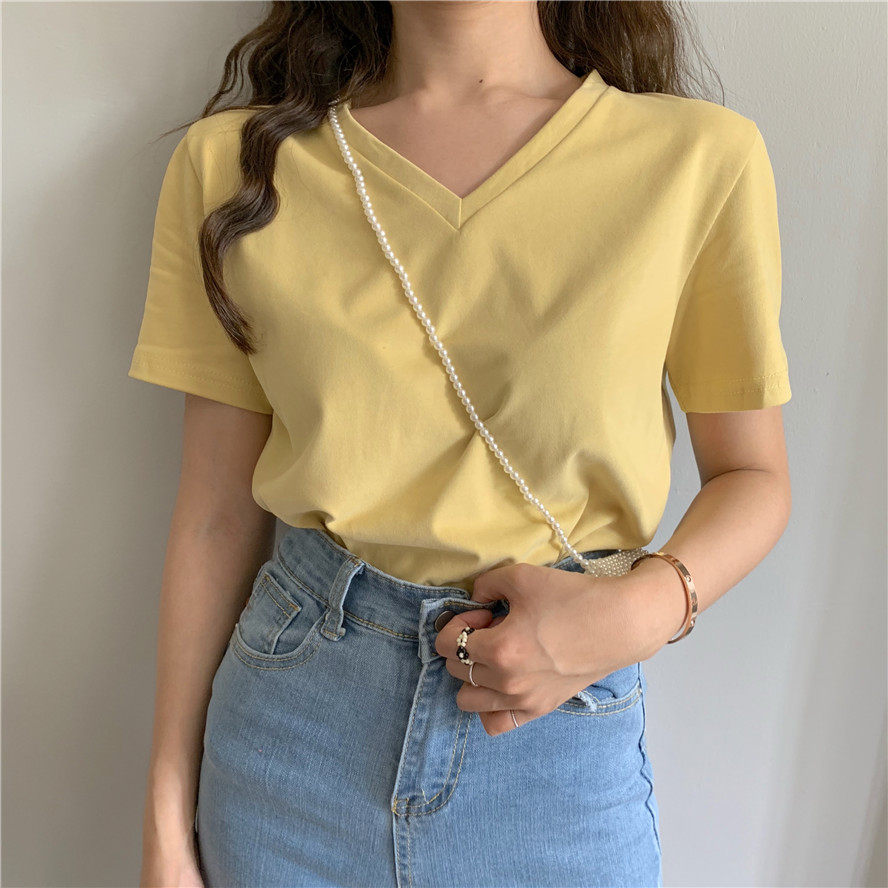 Женские укороченные топы в Корейском стиле с коротким рукавом и v-образным вырезом, 8 видов цветов, лето 2019