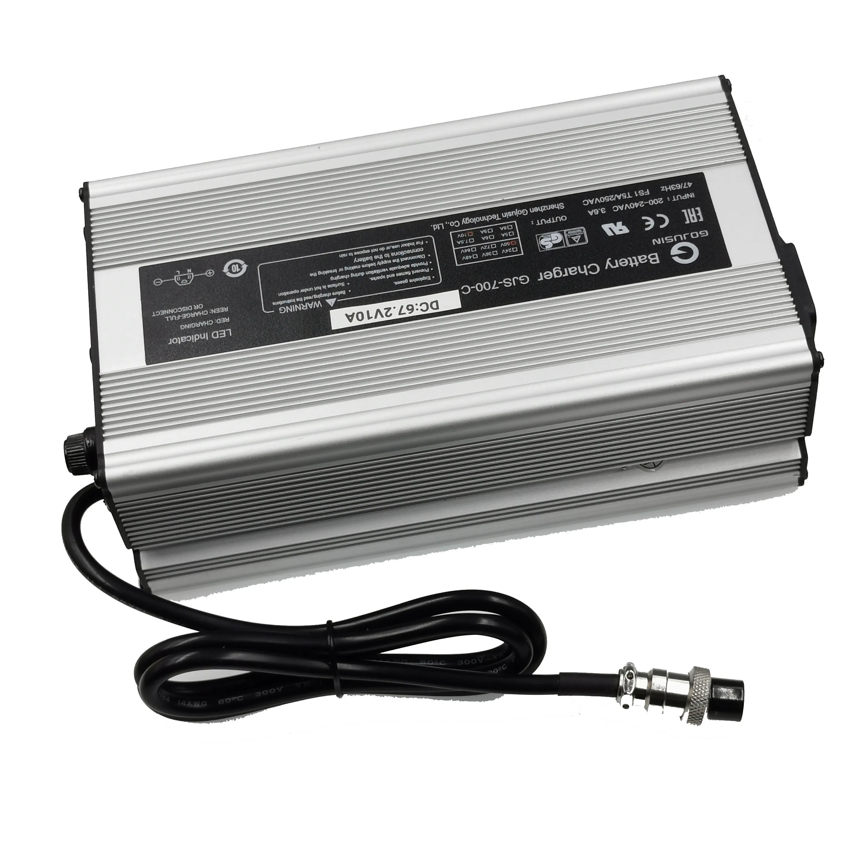 Храктеристика устройства: -Входные параметры: AC200-240V/50 Гц -Параметры выхода: 67,2 в 10 А -Режим зарядки: переключатель постоянного напряжения постоянного тока -Инструкции по зарядке: зарядный красный светильник, зеленый светильник, мигающий светильник -Входной интерфейс зарядного устройства: разъем word -Выходной интерфейс зарядного устройства: может быть настроен в соответствии с требованиями, пожалуйста, свяжитесь с нами -Разъем зарядного устройства: EU / US / AU / UK (четыре дополнительных) -Функции защиты: перегрузки по току/перенапряжения/перегрузки/перегрева/короткого замыкания/обратного подключения и других функций защиты -Материал: металлический алюминиевый чехол -Размер изделия: 215*106*60 мм -Мощность: 672 Вт -Цвет: серебро Описание: -Зарядное устройство имеет корпус из высококачественного алюминиевого сплава, обладает хорошей теплоотдачей, поверхность распыляется кислородом, элегантный внешний вид. -Подходит для зарядки литиевых аккумуляторов с использованием технологии интеллектуального управления MCU. -Охлаждающий вентилятор с контролем температуры, с постоянным током/постоянным напряжением/током/перенапряжением/перегрузкой/перегревом/короткого замыкания/обратным подключением и другими функциями защиты. Посылка включает в себя: 1 шт. 67,2 V 10A Зарядное устройство 1 шт. кабель питания переменного тока