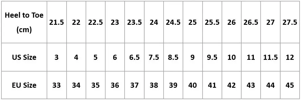 Длина стопы: 21,5см = CN Размер 33 = Выберите US3 Длина стопы 22 см = Китайский размер 34 = Выберите американский размер 4 Длина стопы 22,5 см = Китайский размер 35 = Выберите американский размер 5 Длина стопы 23 см = Китайский размер 36 = Выберите американский размер 6 Длина стопы 23,5 см = Китайский размер 37 = Выберите американский размер 6,5 Длина стопы 24 см = Китайский размер 38 = Выберите американский размер 7,5 Длина стопы 24,5 см = Китайский размер 39 = Выберите американский размер 8,5 Длина стопы 25 см = Китайский размер 40 = Выберите американский размер 9 Длина стопы 25,5 см = Китайский размер 41 = Выберите американский Размер 9,5 Длина стопы 26 см = Китайский размер 42 = Выберите американский размер 10 Длина стопы 26,5 см = Китайский размер 43 = Выберите американский Размер 11 Длина стопы 27 см = Китайский размер 44 = Выберите американский размер 11,5