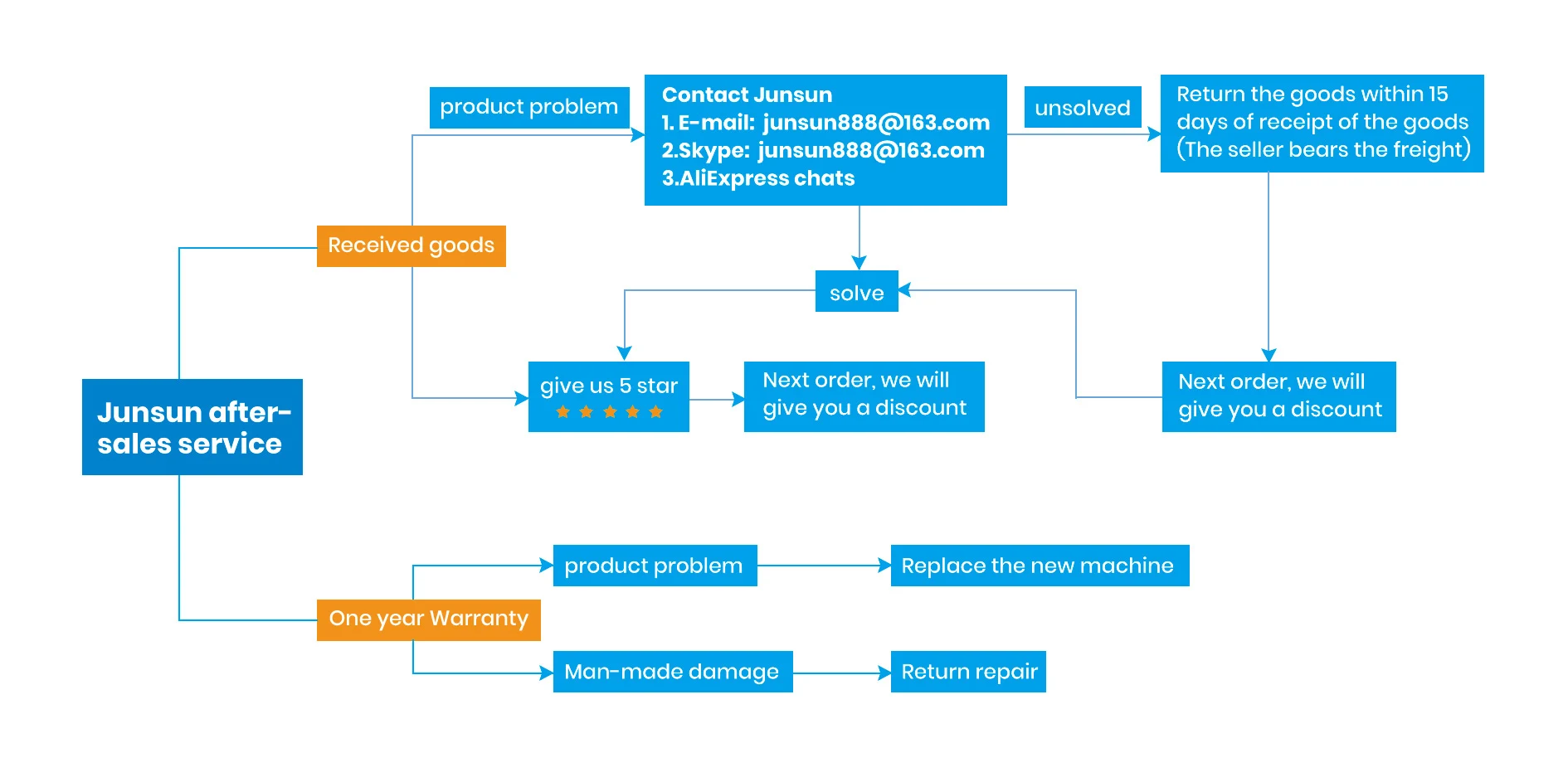 1. AliExpress Топ 10 брендов, стоит доверять; Официальный магазин Junsun имеет 1000K + поклонников, популярных среди покупателей. 2. Все продукты прошли строгую проверку качества перед отправкой, убедитесь, что высокое качество. 3. После подтверждения оплаты доставка будет осуществлена в течение 48 часов со склада в Китае, а доставка в течение 24 часов с местного склада, ES, EU, RU, PL Warehouse Delivery. (Время рабочего дня) 4. Если у продукта возникла проблема в течение 365 ДНЕЙ после подтверждения получения, мы заменим новую машину непосредственно для вас, но, пожалуйста, сначала свяжитесь с нами, чтобы решить проблему послепродажного обслуживания. Данная гарантия не распространяется на ущерб, вызванный несчастным случаем, неправильным использованием, неправильным использованием или модификацией продукта.