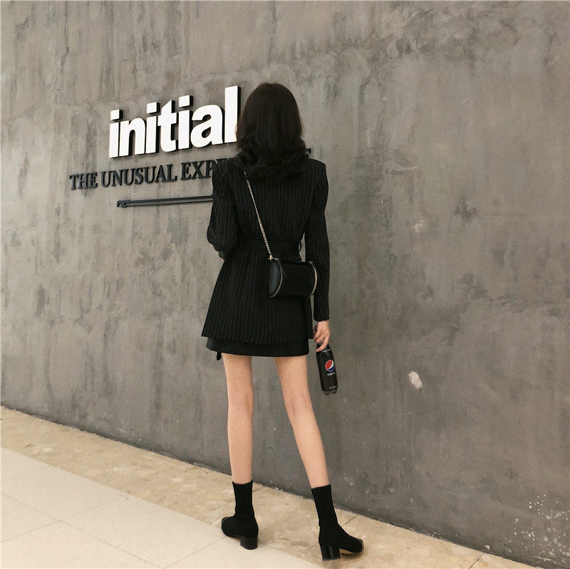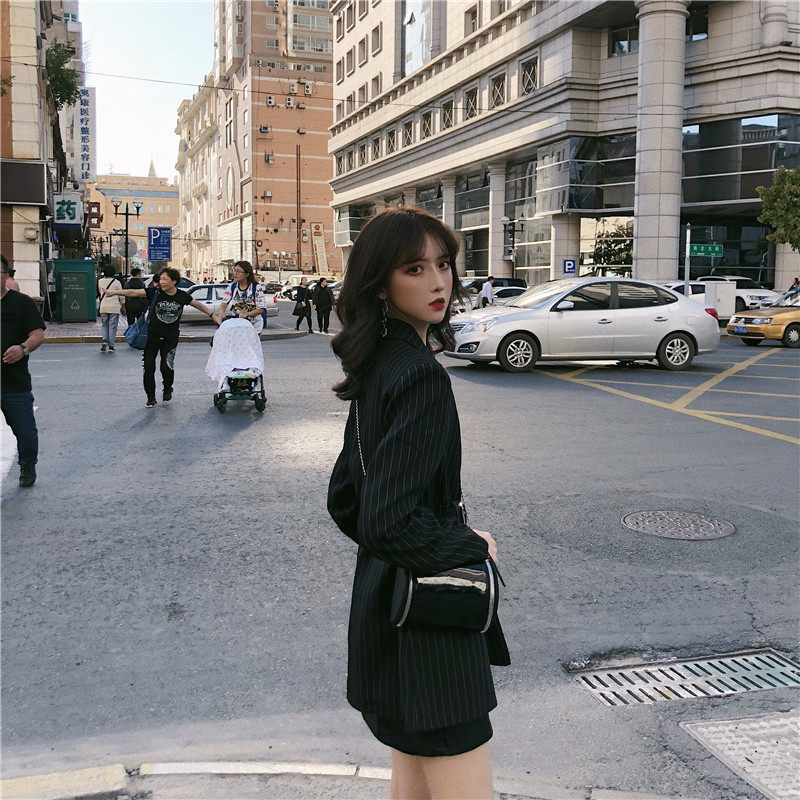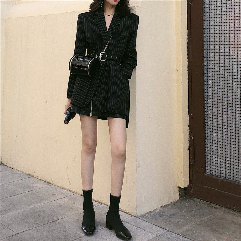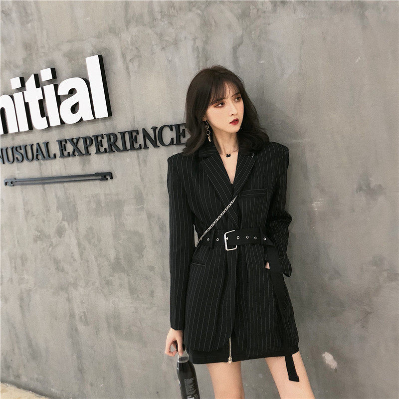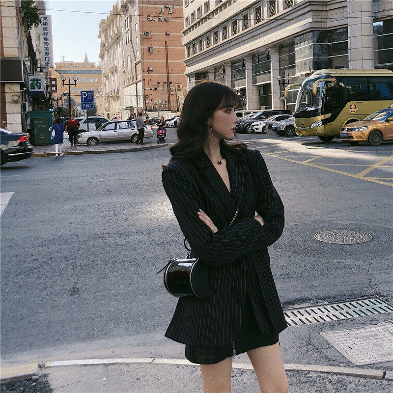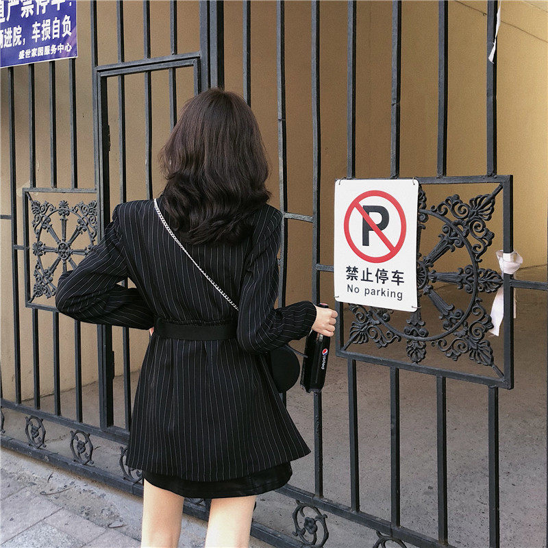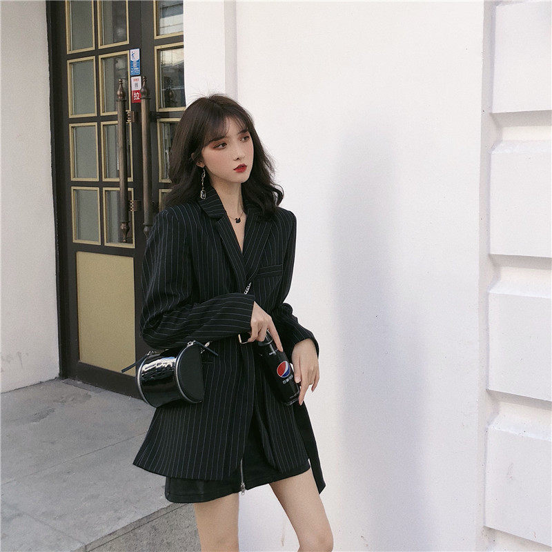 Корейский полосатый черный блейзер средней длины куртка с длинным рукавом зубчатый пиджак Женский Повседневный блейзер для женщин