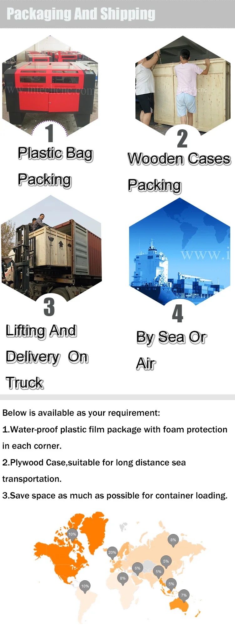 1. У нас есть 3 слоя посылка. Снаружи мы используем Деревянный чехол. В середине машина покрыта пеной, чтобы защитить машину от тряски. Для внутреннего слоя машина покрыта уплотненным полиэтиленовым пакетом для водонепроницаемости.
