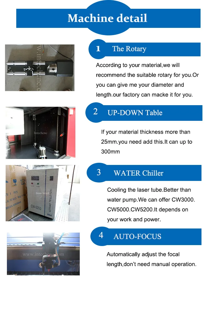 1. Настройка высокой мощности и качества лазерной трубки, может работать 8000 ~ 10000 часов (зависит от мощности лазера).
