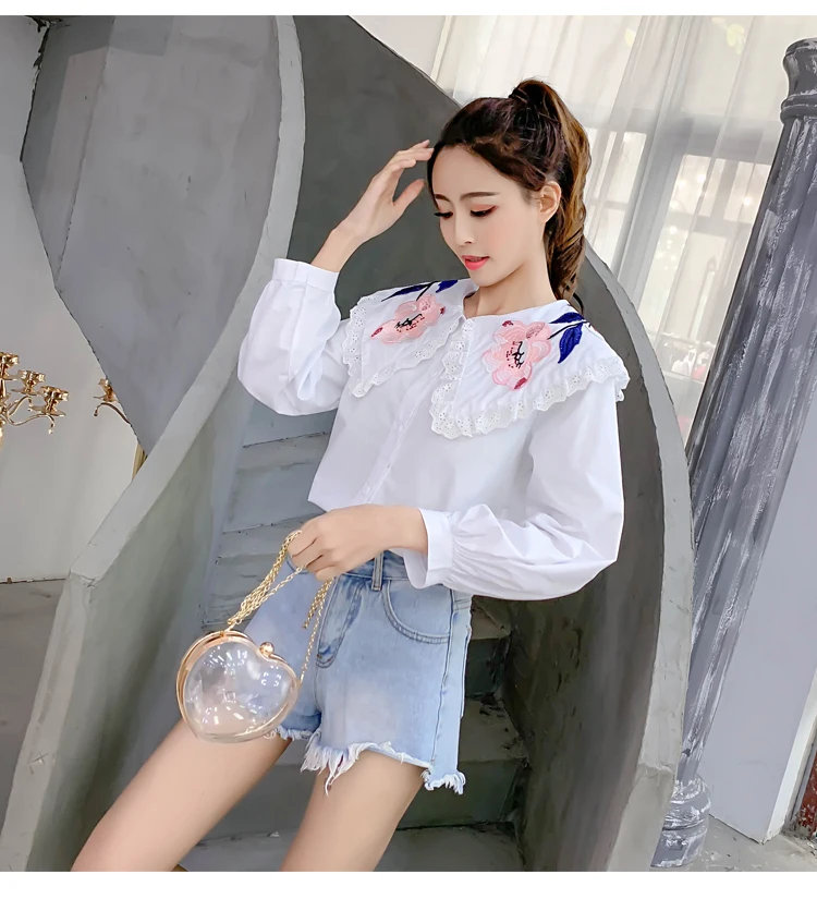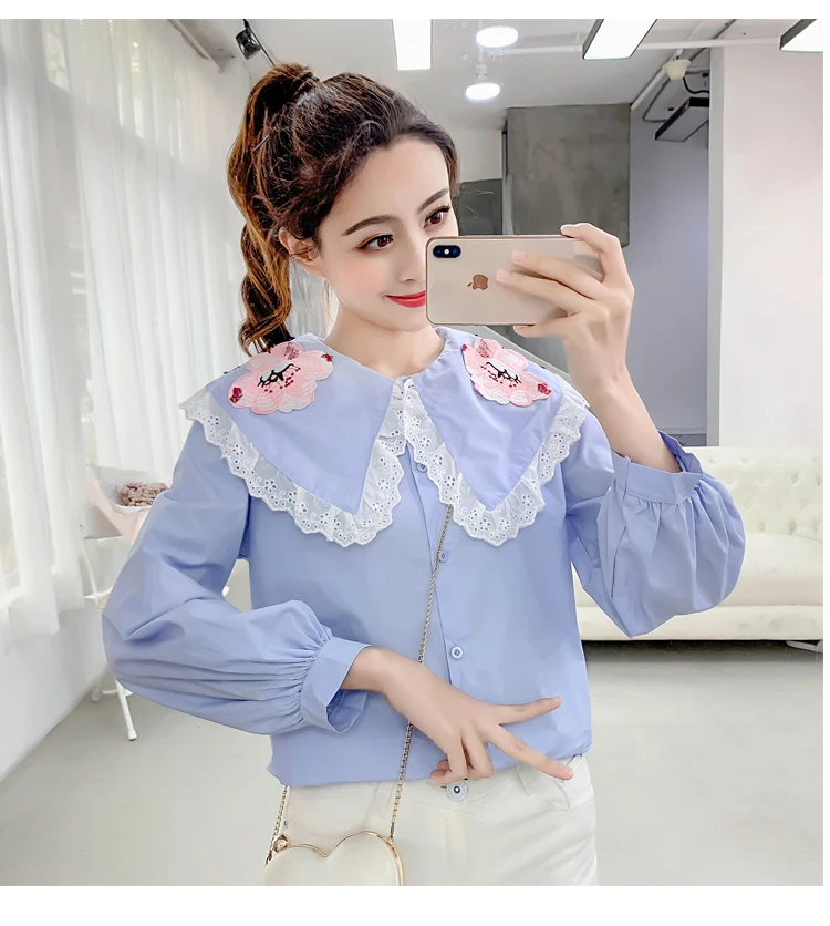 Новинка, Цветочная вышивка, длинный рукав, винтажная блузка, воротник Питер Пэн, рубашка, Blusas Feminino, женские блузки, женские топы, модные, милые