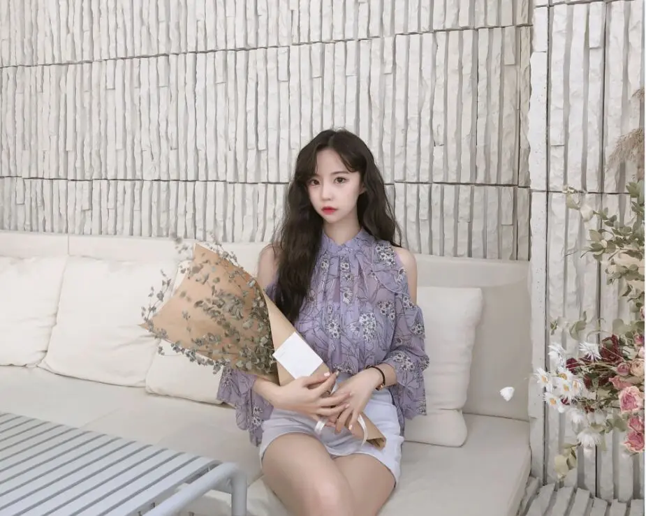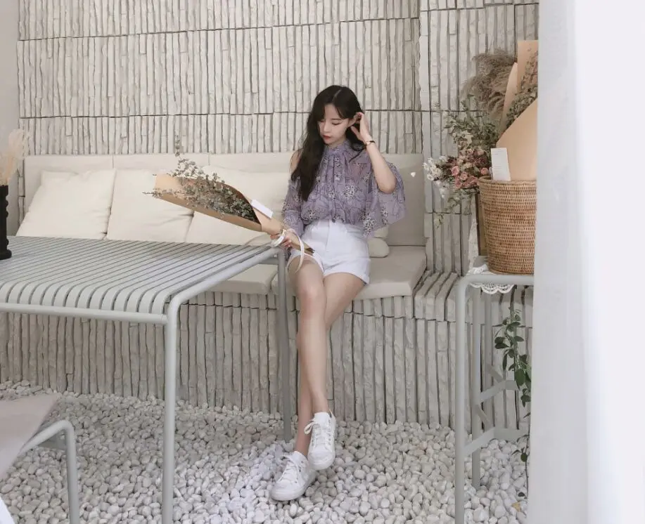 Женская кружевная рубашка с коротким рукавом-фонариком однотонная Повседневная