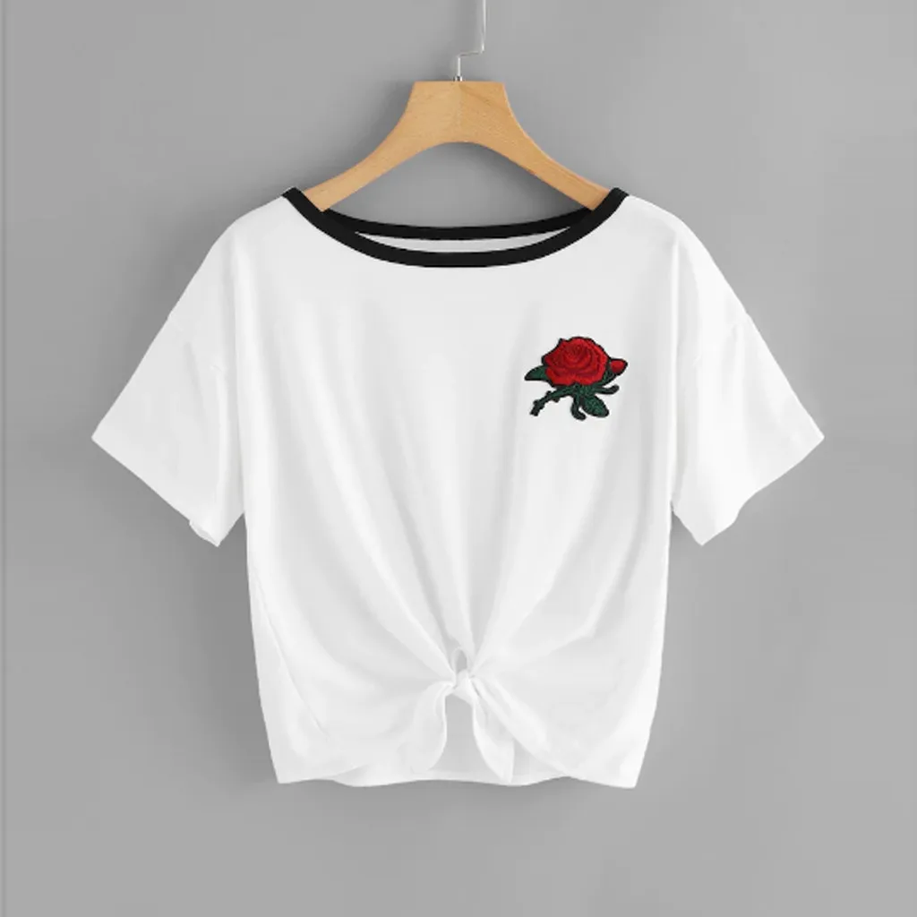 1,1. Особенности: Повседневная футболка, круглый вырез, короткий рукав, вышивка аппликацией, пуловер, футболка, повседневные топы, повседневная одежда, стильный и модный дизайн, Летняя Повседневная блузка.