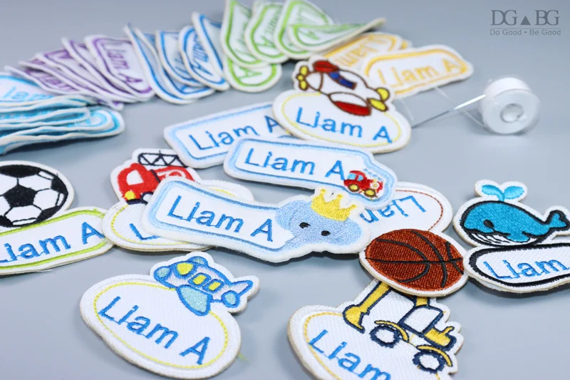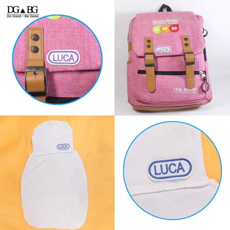 Пришили название наклейки на сумку, ткань, брюки и так далее.