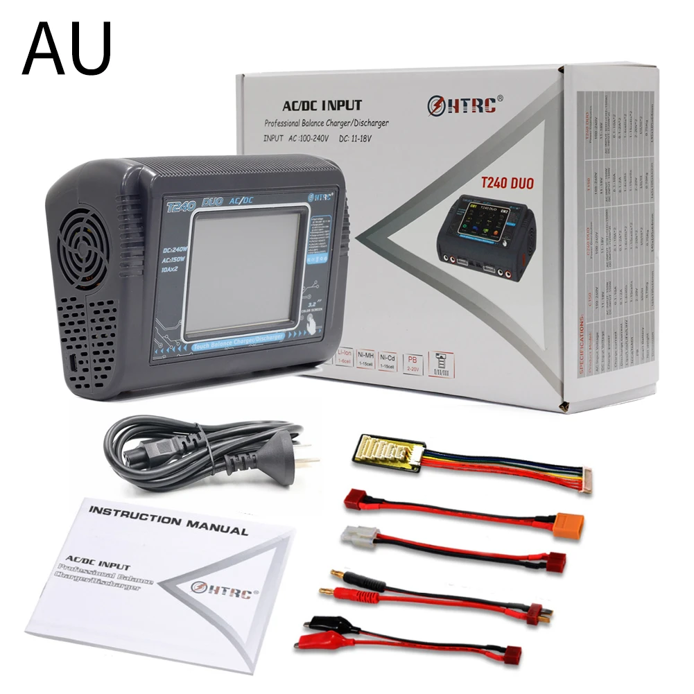 T240-это новое дизайнерское двойное зарядное устройство HTRC, которое может заряжать два разных типа батарей одновременно. Многофункциональный, высокая мощность, использование 3,2 дюйма цвет ЖК-дисплей Toch экран дисплея, легкая работа, встроенный вентилятор охлаждения, DC 11-18V или AC 100-240 В двойная мощность. Предназначен для зарядки аккумуляторов LiPo LiFe Lilon LiHV NiCd NiMh Pb Smart.