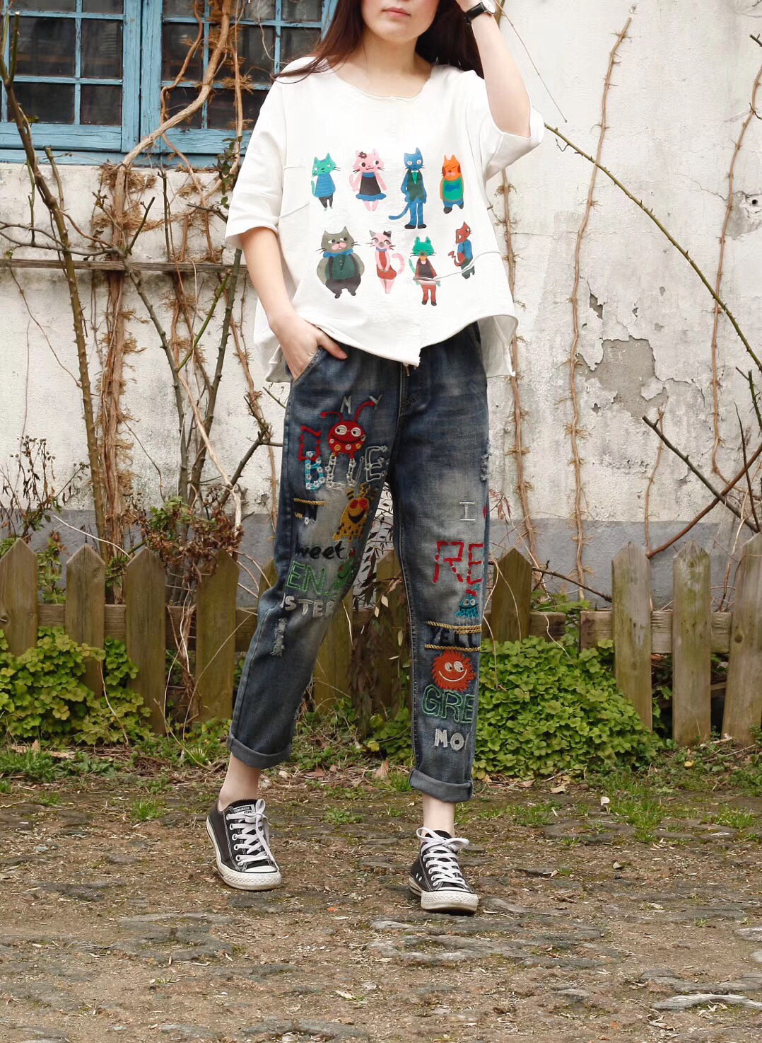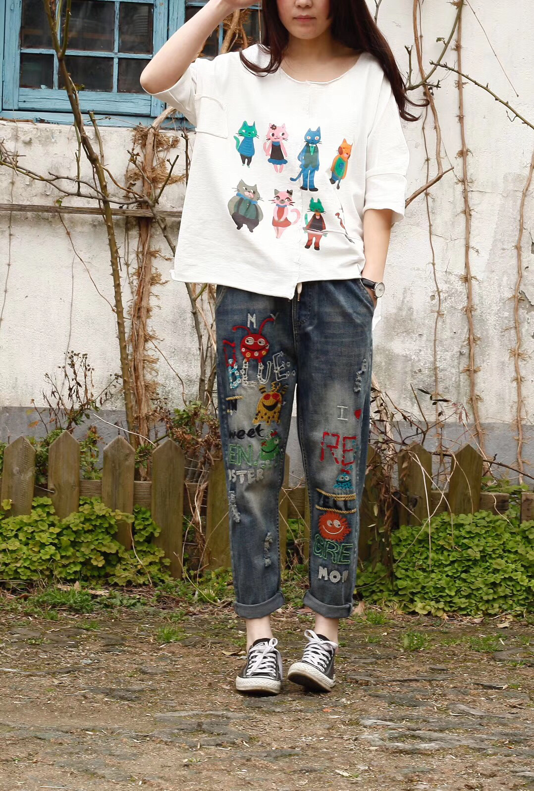 Повседневные джинсовые брюки mori girl, брюки до щиколотки с эластичной талией и мультяшной вышивкой