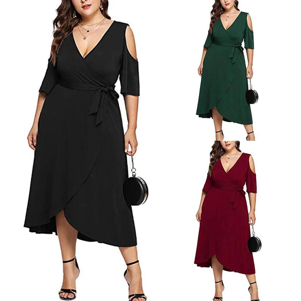 Женское платье с длинным рукавом, однотонное платье размера плюс с v-образным вырезом и открытыми плечами, вечерние мини-платья