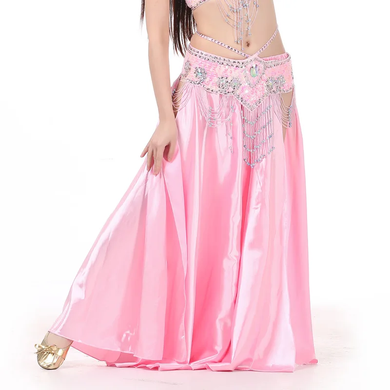 Женский костюм для танца живота, сексуальное двухбоковое раздельное платье для танца живота, Женская цветная атласная юбка, танцевальная одежда для сцены (без пояса)