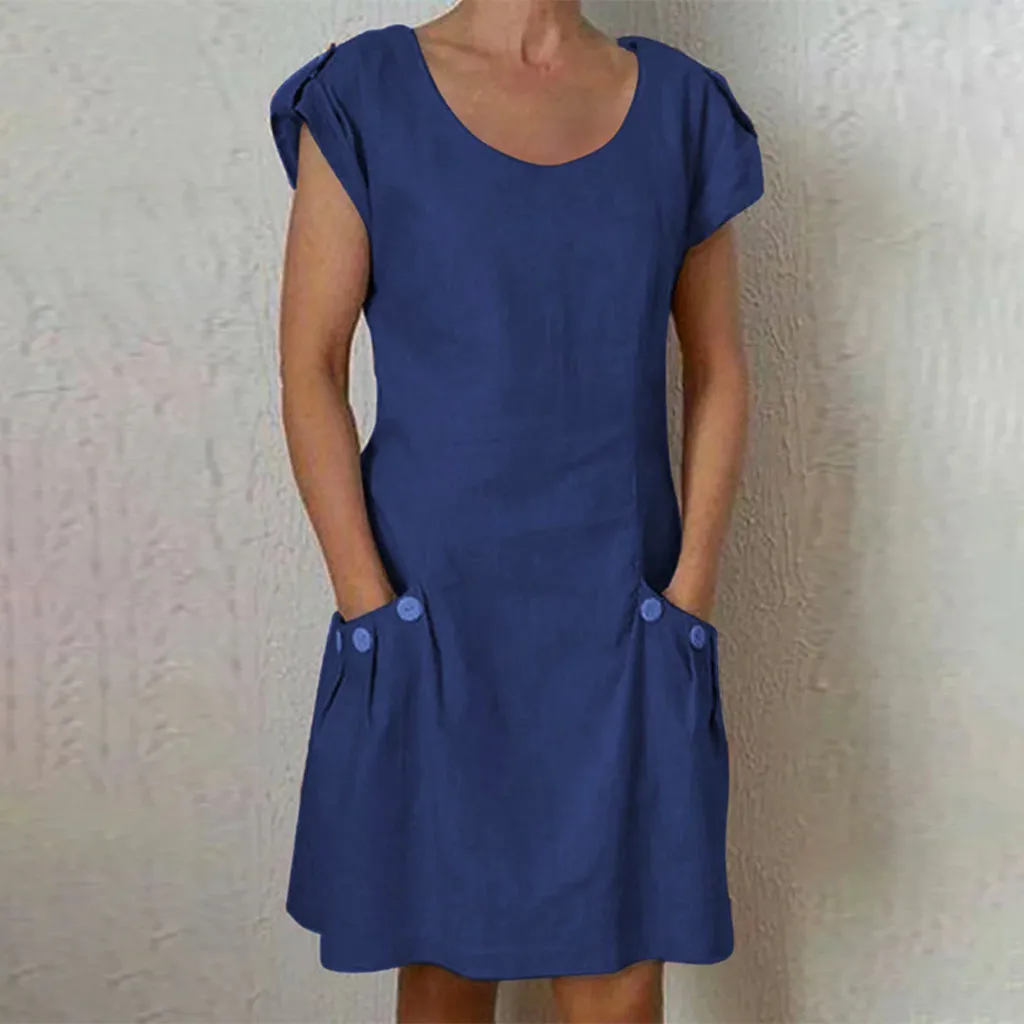 Женские повседневные однотонные плиссированные карманы с o-образным вырезом повседневные платья с пуговицами