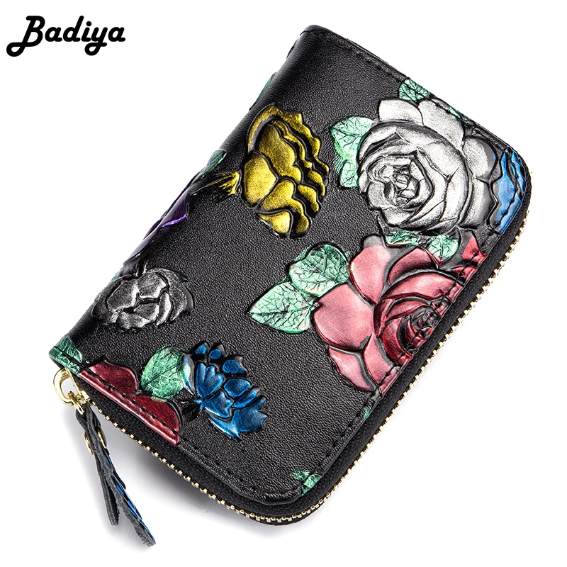 Женский кожаный кошелек на молнии с цветными рисунками цветов роз, с отделением для карт
