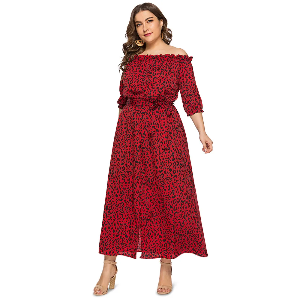 Леопардовое платье с цветочным принтом, большие размеры, открытые плечи, с разрезом, женское весенне-осеннее платье-туника, элегантное сексуальное офисное платье Макси