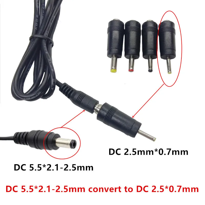 Размер постоянного тока Внутренний диаметр составляет 2,1-2,5 мм Внешний диаметр 5,5 мм Полярности Внутренняя часть положительная (+) Внешний является отрицательным (-) С 4 насадками для преобразования постоянного тока, можно изменить на DC 4,0 мм x 1,7 мм DC 3,5 мм x 1,35 мм DC 3,0 мм x 1,1 мм DC 2,5 мм x 0,7 мм Подходит для различных устройств.
