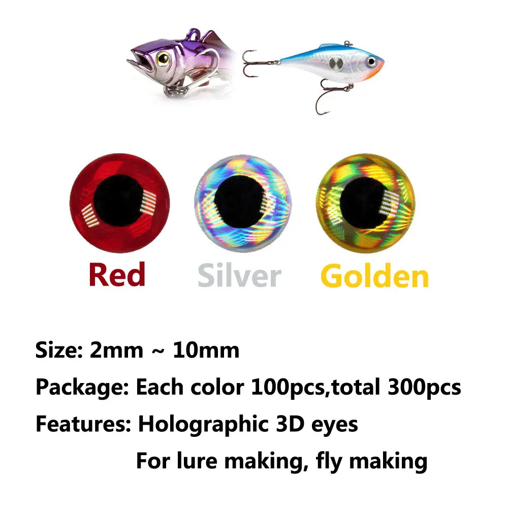 300 шт./упак. Размер: 2 мм ~ 10 мм Каждый цвет 100 шт, золотой, красный, серебристый Особенности: Голографические 3D глаза для изготовления приманки, изготовления летучих мышей
