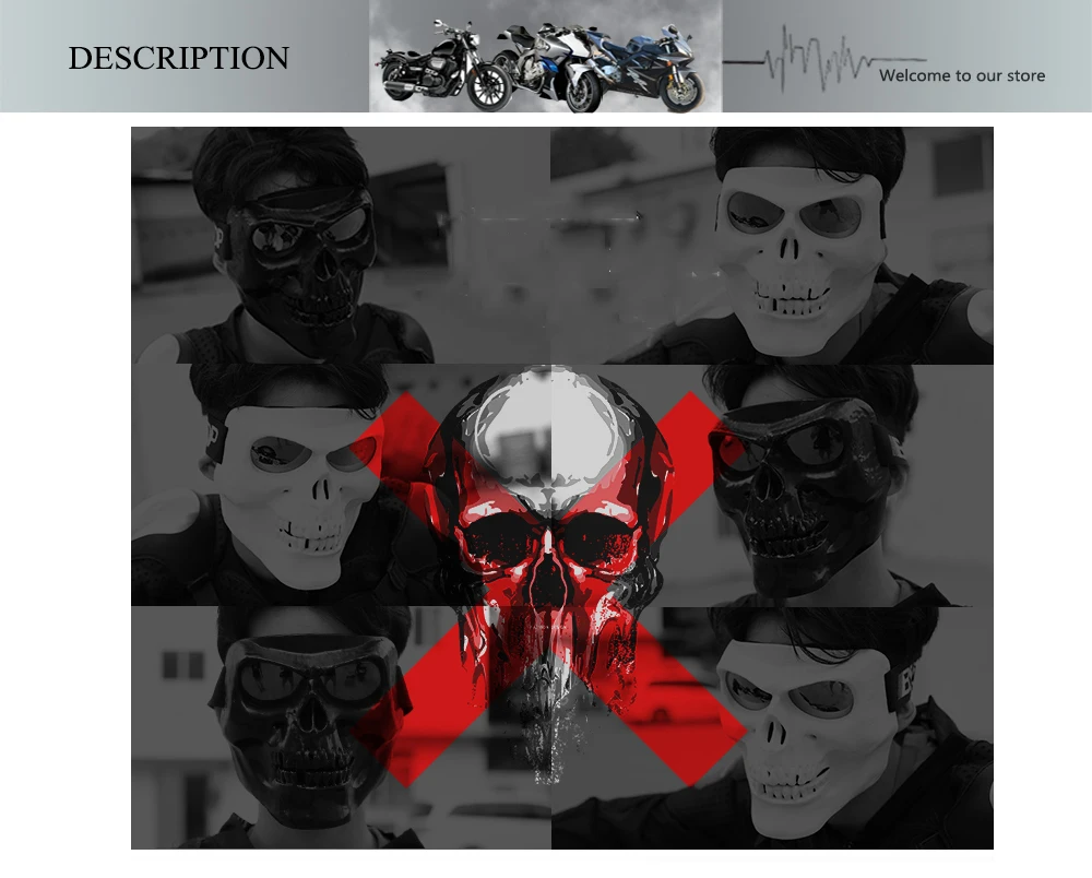 1. Дизайн продукта: лоб маски черепа не полностью покрыт, он очень подходит для мотоциклетных шлемов, полушлемов и других типов шлемов, чтобы обеспечить безопасность, когда вы наслаждаетесь скоростью. 2. Высокое качество: маска для очков изготовлена из прочного АБС-материала, который подходит для лица. Линзы с защитой от ультрафиолетовых лучей защищают от ветра, влаги и пыли, обеспечивая отличную защиту. 3. Комфортный опыт: высококачественный наполнитель губки может эффективно снять давление лица. Губка высокой плотности подходит для лица для комфортного использования, поэтому вам не придется беспокоиться о замене. 4. Дышащий и регулируемый: есть вентиляционные отверстия вокруг носа, чтобы воздух мог циркулировать без удушья и затруднения дыхания. Регулируемая эластичная тесьма обеспечивает защиту маски, не беспокоясь о соскальзывании маски.