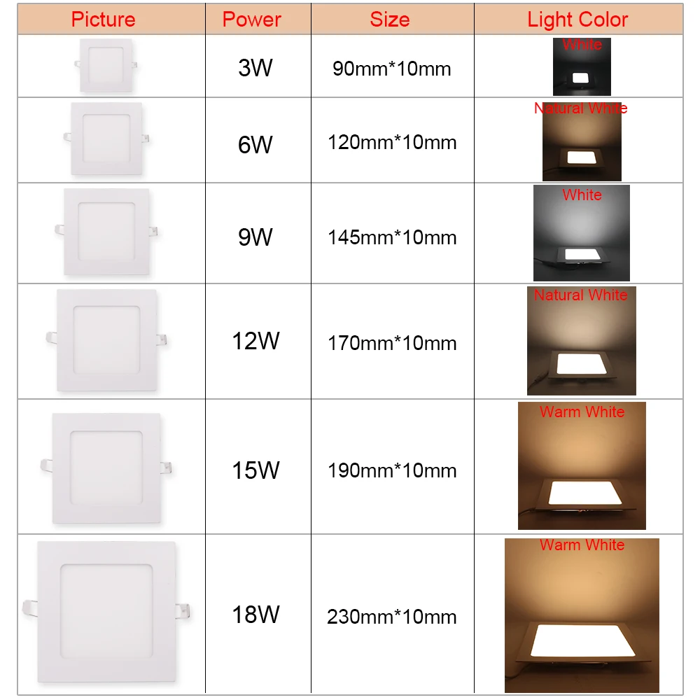 Внимание: Вариант Белый = натуральный белый (4000-4500K) Описание продукта: Тип изделия: светодиодные панели Мощность: 3 Вт/6 Вт/9 Вт/12 Вт/15 Вт/18 Вт Угол луча (°): 120 Входное напряжение: AC110-220V 50-60 Гц Применение: дом, отель, ванная комната офисная компания магазин .. и т. Д. Рабочая температура: -40 - 55 °C Коэффициент мощности: ПФ> 97% Срок службы:> 50000 часов Материал корпуса: Алюминий Гарантия: 1 год Особенности: 1) Защита окружающей среды защиты 2) безопасный и простой в установке 3) длительный срок службы, более 50000 часов 4) Нет опасности разбитого стекла 5) низкое энергопотребление 6) Высокая эффективность, экономия энергии более 70% ~ 80% 7) модный дизайн 8) корпус из алюминиевого сплава