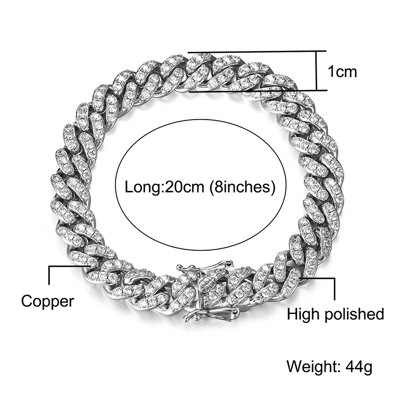 Металл: медь + стразы AAA Размер: 18*0,1 см, 20*0,1 см Дизайн: хип-хоп Снаряженная кубинская цепочка браслеты Применение: свидание/на каждый день/Свадьба/Юбилей/предложение Подарок: друг/Папа/Муж/бойфренд Подходит для: молодых и взрослых мужчин Каждый товар поставляется с подарочной сумкой