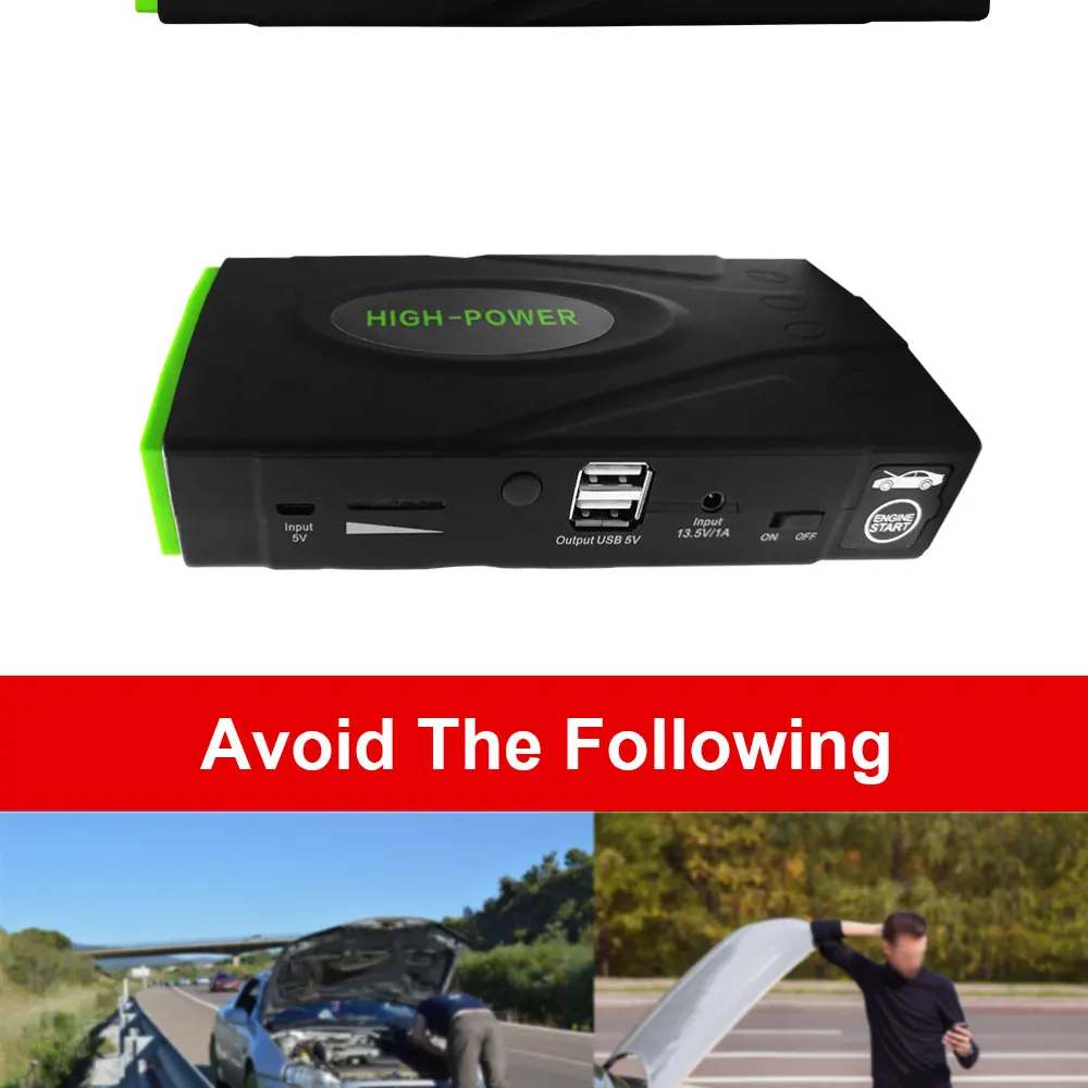 Стартер для автомобиля, внешний аккумулятор, пусковое устройство высокой емкости, автомобильное зарядное устройство, усилитель, портативное зарядное устройство для стартера автомобиля, 600A, 12 В, 16800 мАч Модель: TM10E Вход: 13,5 V/1A Вход: 5 В/2 А Выход: 5 В/2 А Начальный ток: 300 А Пиковый ток: 600A 16800 мА-ч Выход: 12 В Размеры: 165*79*40 мм Выход USB P: 5 В, 2 А Режим зарядки; При постоянном токе/13,5/1A или 5V2A Начальный ток: 300 А Пиковый ток: 600A(3S) Срок службы: 3000 раз Диапазон температур:-20-60 по Цельсию Специальные меры предостережения для автомобиля, EPS 1. Пожалуйста, поместите синюю вилку достаточно в автомобиль EPS. 2. Убедитесь, что число световых индикаторов не менее 3. 3. Если автомобильный ЭПС не может запускать автомобиль, пожалуйста, остановите, чтобы запустить автомобиль. Пожалуйста, проверьте зажим автомобильного аккумулятора, плотно прижатый или нет. И проверьте зажим аккумулятора, плотно ли Он зажат или нет, и проверьте, есть ли ржавчина или грязь в автомобиле? Запуск автомобиля снова после очистки и проверки 4. Во время запуска. Если синий индикатор выключен или не работает, пожалуйста, зарядите Для автомобиля EPS. Тогда это сработает. 5. Во время запуска. Если автомобильный ЭПС не может продолжать запускать автомобиль после запуска 3-5 раз. Пожалуйста, прекратите запуск автомобиля. Пожалуйста, проверьте другие поломки. Другой мудрый, это сделает предохранитель и Авто EPS сломанным. 6. Когда автомобиль начинает, удалите Автомобильный Кабель EPS из автомобиля и отсоедините красные и черные зажимы к клеммы автомобильного аккумулятора в течение 30 секунд Примечание: 1. В течение длительного времени чехол может храниться, рекомендуется поддерживать некоторые батареи Емкость и продукт должен быть оплачен не реже одного раза в три месяца 2. В процессе обслуживания или зарядки, Слабый нагрев оборудования является нормой, но не вина 3. Рекомендуется использовать продукт при комнатной температуре, вдали от влаги, с высоким температурным диапазоном. 4. Храните товары в сухом месте, вдали от влаги и эрозионных материалов 5. Не используйте грубые химические вещества для очистки, такие как мыло или моющее средство. 6. В чехол батареи, утечки или специфический запах, пожалуйста, прекратите использование батареи сразу 7. Не оставляйте товары при использовании. 8. Дети должны использовать аккумулятор в соответствии с инструкцией parernts в строгом соответствии С содержанием спецификации, чтобы гарантировать правильное использование. 9. Пожалуйста, не сбрасывайте или не Горите отходы, мобильный источник питания и цените природу.