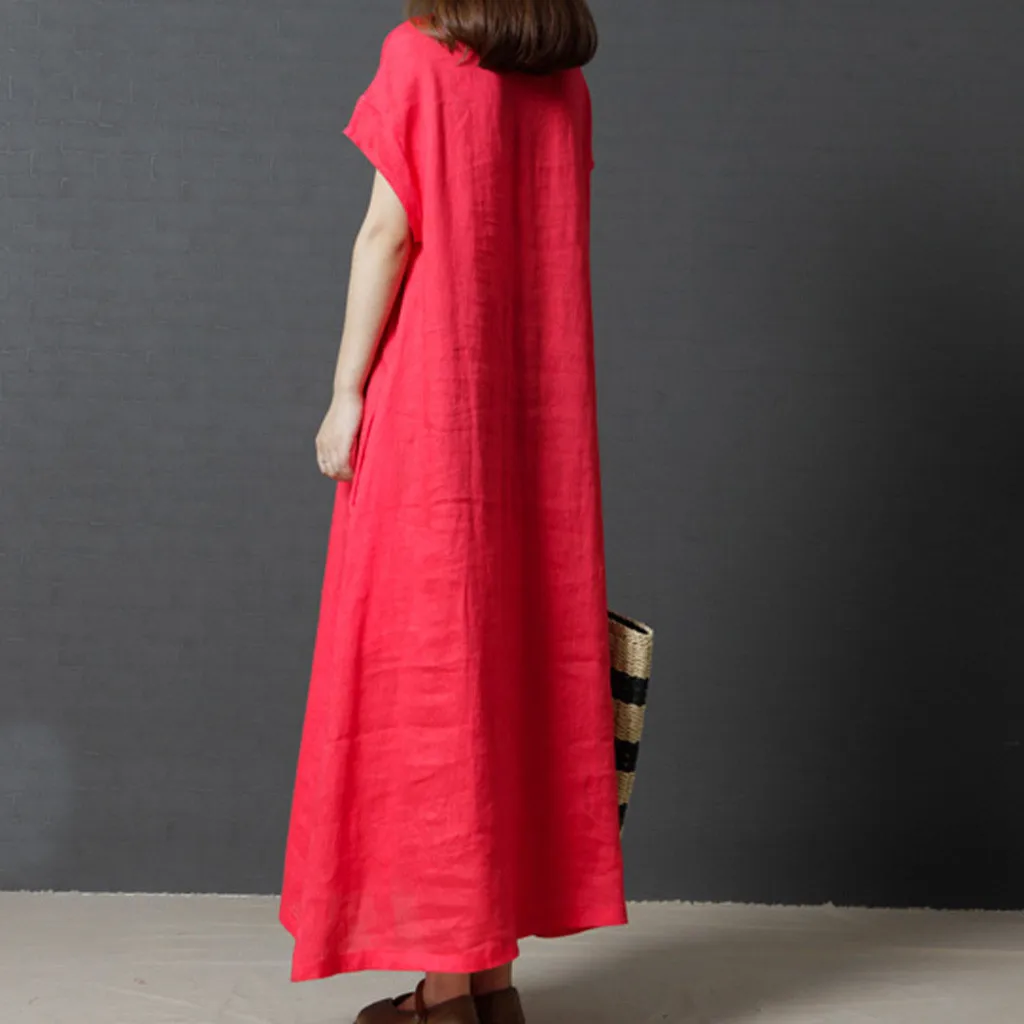 Женское летнее однотонное Плиссированное длинное платье из хлопка и льна с коротким рукавом