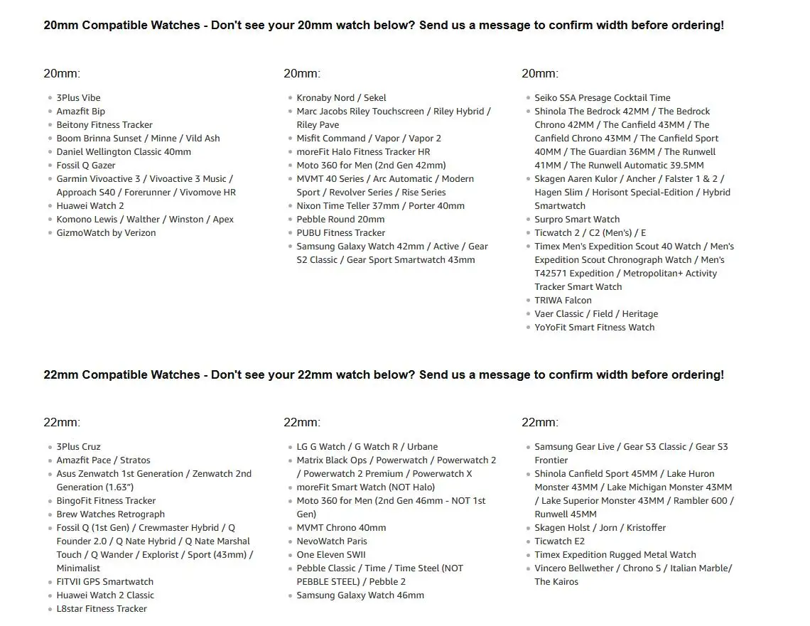 20 мм:Подходит для Samsung Gear S2 Classic, MOTO 360 2-го поколения 42 мм (мужской), Ticwatch 2-го поколения, Huawei watch 2-го поколения;