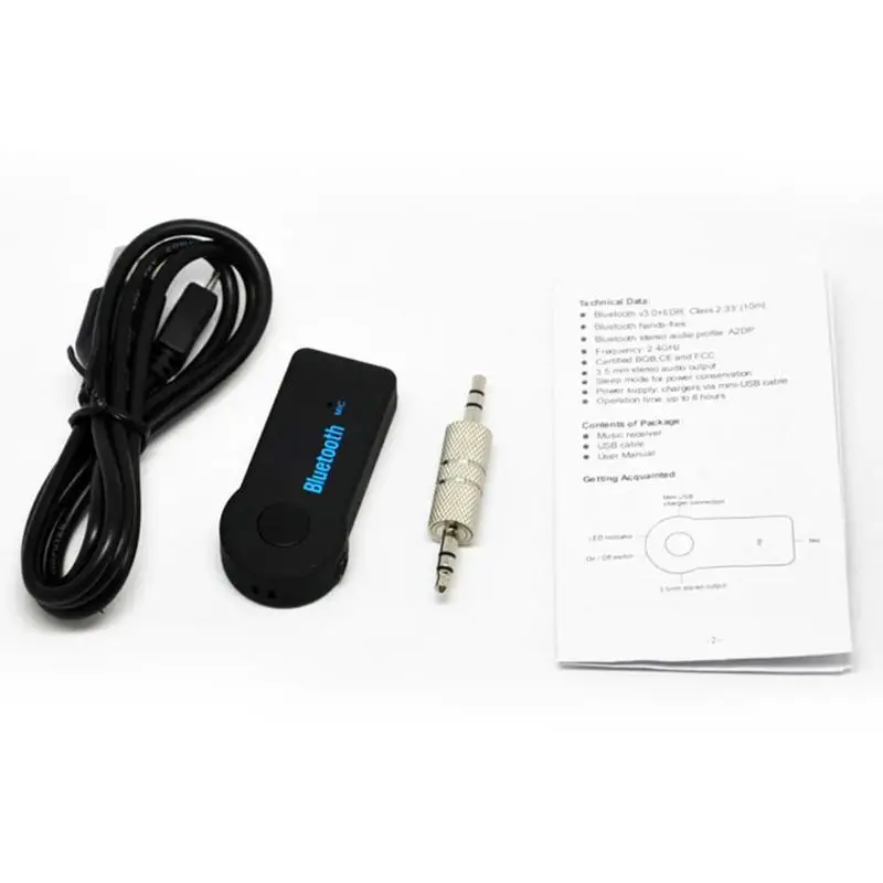3,5 мм Jack AUX Беспроводной Bluetooth 3,0 Hands-free адаптер вызова автомобильный аудио музыкальный приемник Особенности: Функция громкой связи Bluetooth; Поддержка Bluetooth A2DP стерео; CE, FCC, BQB сертификация; Режим сна, энергосбережение; Технические характеристики: Bluetooth: V3.0 + EDR Максимальное расстояние передачи: 10 м Частота: 2,4 ГГц Стерео Входной разъем: 3,5 мм Источник питания: мини-usb кабель для зарядки Время работы: до 8 часов воспроизведения музыки Цвет: черный Вес брутто: 37 г Применение: подходит для планшетов с поддержкой Bluetooth, мобильных телефонов, компьютеров, PSP и т. д.