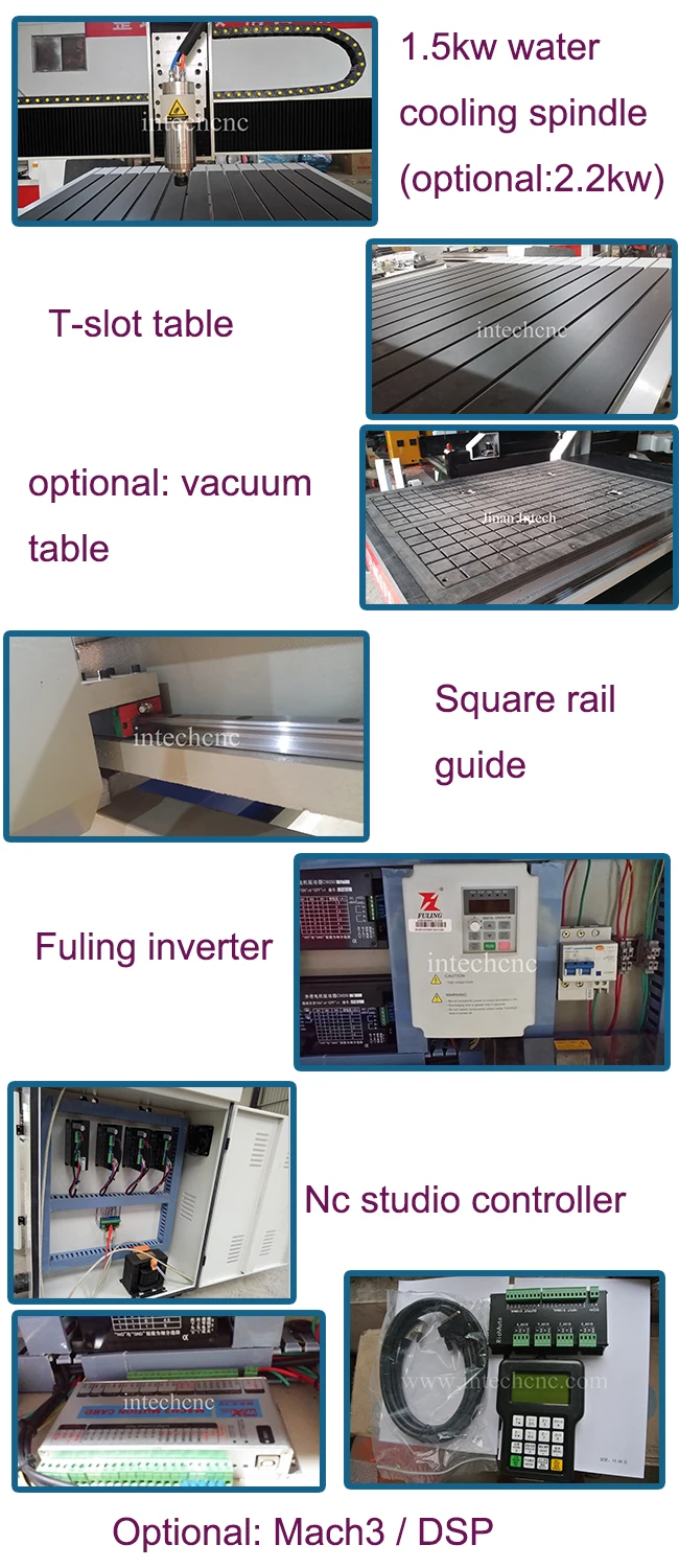 Подходит для промышленности:Для гравировки и резки рекламы, обработки камня, изготовления пресс-форм, обработки древесины, изготовления ремесел, светильник для резки коробок, Резки Строительных моделей, резки внутренних украшений, обработки пресс-форм, изготовления вывесок, светильник обработка акриловой доскиПодходит для материалов:ПВХ, резина, ABS пластина, акрил, двойной цветной лист, дерево, МДФ, органическое стекло, медь, ACP, пластик, металл и так далее.Особенности:1. Весь корпус машины чугун, который имеет сильный подшипник и делает машину работать стабильно2. Он принимает высокоточную стойку и линейную направляющую, которая может автоматически устранить зазор3. 1,5 кВт шпиндель водяного охлаждения, который является прочным и имеет сильную мощность резки4. Использование высокоскоростного драйвера, шагового двигателя, который улучшает эффективность работы.5. Сильная совместимость, подходит для всех видов программного обеспечения с цифровым управлением: Artcam type3, ucancan и различных CAD/CAM программного обеспечения. Он может легко сделать анаглиф, гравюр и трехмерные художественные слова и т. Д.Основные части 3d Китай cnc Камень cnc маршрутизатор машина маршрутизатор: