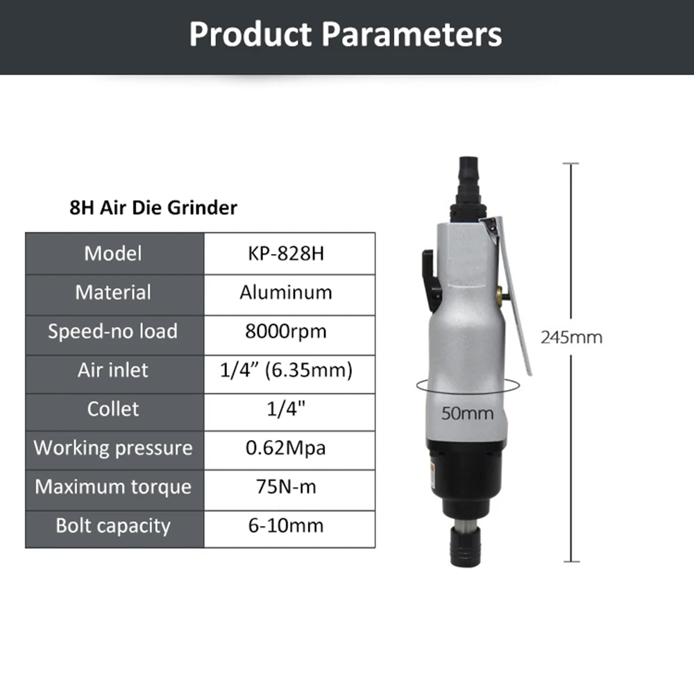 Этот Электроинструмент имеет шарикоподшипниковую конструкцию, которая прочная, но легкая. Он поставляется с 1/4 дюймовым Цангом, задней выхлопной и запорной дроссельной заслонки. Контурная ручка обеспечивает больший комфорт во время работы. Компактная и легкая, задняя система потока воздуха направляет воздух вдали от рабочей поверхности. Угловая шлифовальная машина идеально подходит для сварки, удаления заусенцев, подготовки поверхности и полировки.