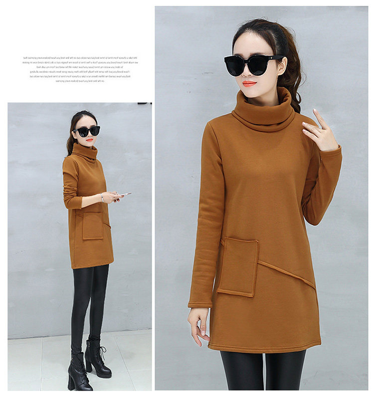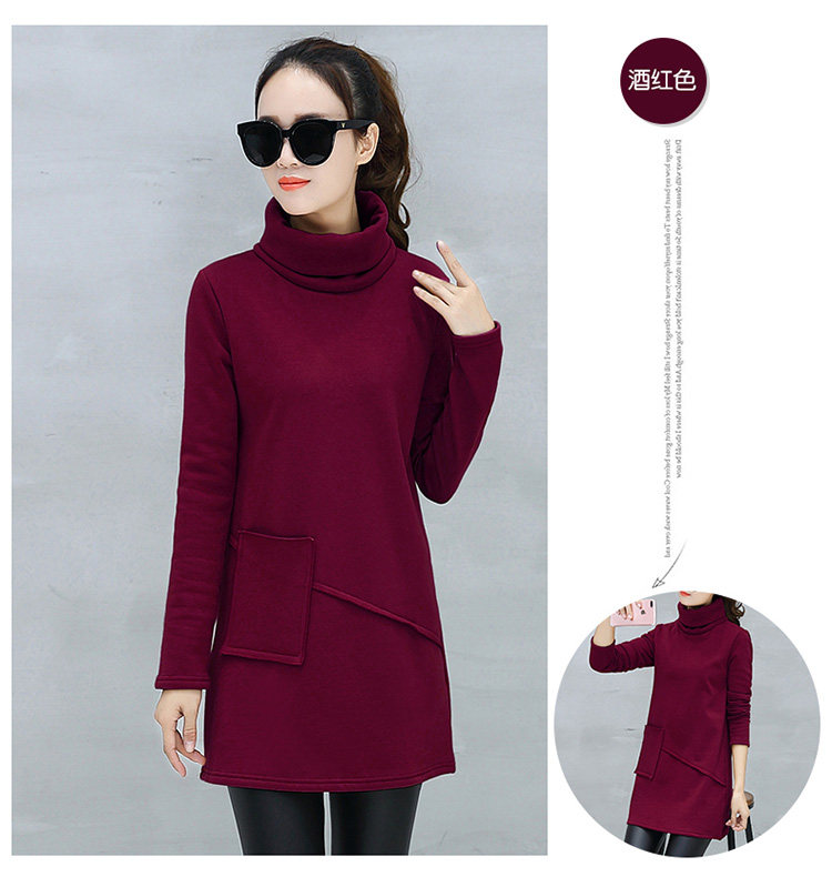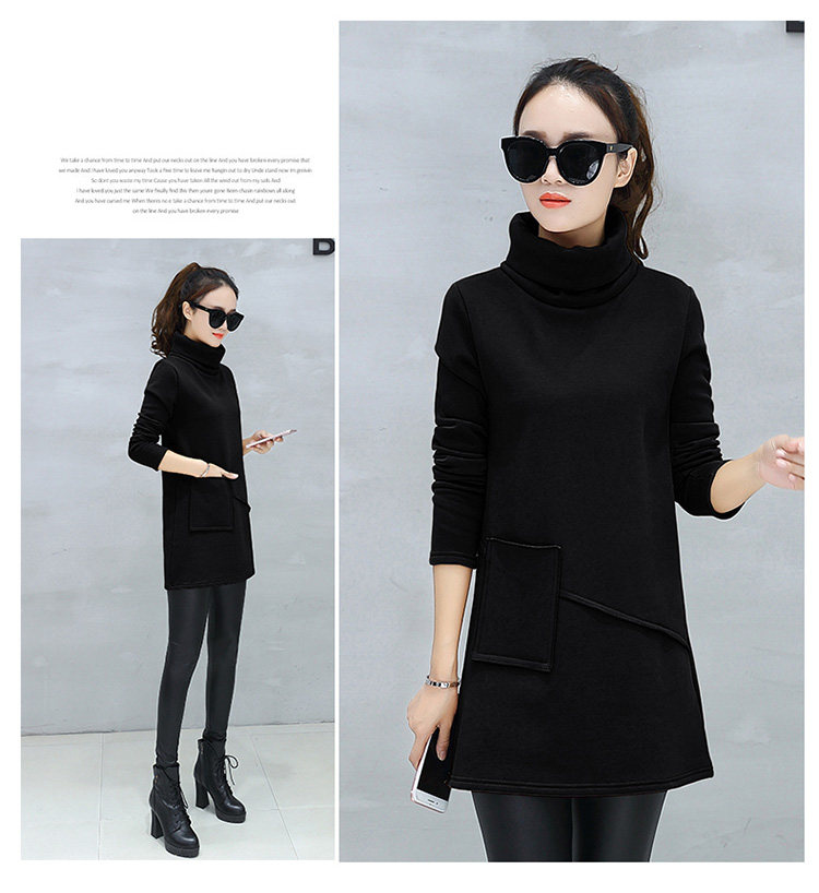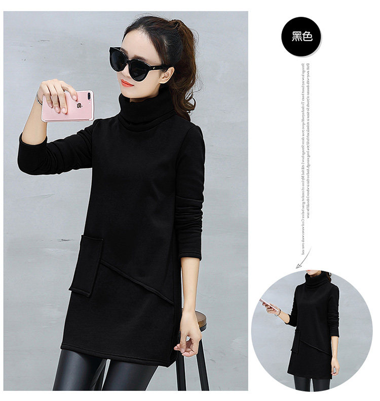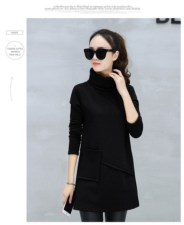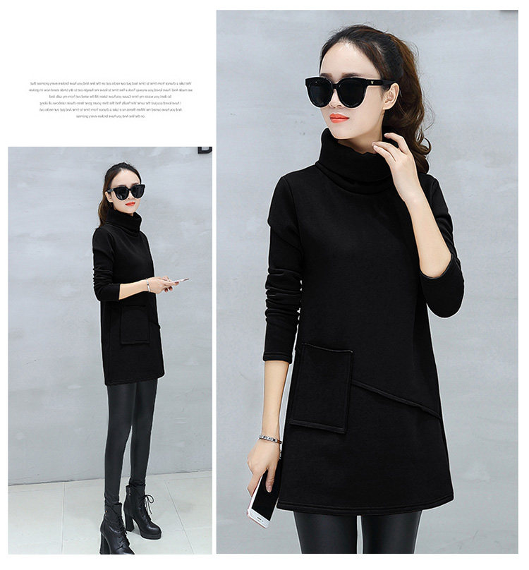 Велюровое флисовое платье зимнее женское платье с длинным рукавом и карманом маленькое черное хлопковое теплое бархатное платье-туника с высоким воротником DV531