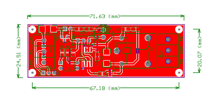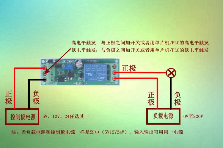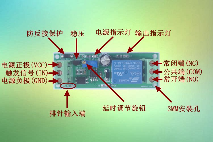 Функция Описание С модулем выключатель с выдержкой времени: индикатор питания загорается после включения модуля и ждет сигнала для запуска. Как только есть триггер сигнала (touch), реле действует немедленно. Реле всегда включается и выключается, а нормальное отключение включается и выключается. В то же время нагрузка начинает работать. При достижении установленного времени реле возвращается в норму, и нагрузка прекращает работать. Когда сигнал снова срабатывает, модуль повторяет вышеуказанные действия, пока источник питания не отключен. (Примечание: время задержки-это время запуска триггера, когда время задержки не достаточно, запуск снова считается неправильным действием; если непрерывный триггер и время запуска превышает установленное время, Реле потеряет функция задержки и будет работать до тех пор, пока триггер не исчезнет, и реле немедленно прекратит работать в ожидании эффективного триггера). Power-on delay модуль отключения: Этот модуль не нужен триггер сигнала, то есть триггерный терминал не должен ничего подключать, индикатор питания и индикатор действия реле включены одновременно после включения модуля, реле часто включается и выключается, нормальное включение и выключение, запуск нагрузки, Когда наступает заданное время, реле возвращается в норму, нагрузка прекращается (примечание, блок питания модуля всегда находится в процессе задержки). Когда модуль будет повторно заряжен, реле повторит вышеуказанные действия. Модуль подключения питания-на задержке: Этот модуль не нужен триггер сигнала, то есть триггерный терминал не должен ничего подключать, индикатор питания на после включения модуля, реле не действует, когда установлено время (примечание, Блок питания модуля всегда находится в блоке питания во время процесса задержки), выходные индикаторы включены, реле действия, часто включается и выключается, часто включается и выключается, загрузка начинает работать до модуля. Когда питание выключено, нагрузка перестанет работать; Когда модуль будет повторно заряжен, реле повторит вышеуказанные действия. Модуль включения питания: Этот модуль не нужен триггер сигнала, то есть триггерный терминал не должен ничего подключать, индикатор питания модуля загорается после включения питания, пока реле начинает подключаться и разъединять непрерывно, и продолжает циркулировать бесконечно до сбоя питания (Обратите внимание, что время включения и отключения не может регулироваться отдельно, можно регулировать только вместе, общая пропорция составляет около одного к одному, требует очень точных клиентов не бить.) V характеристики продукта 1. Наш продукт соответствует стандартам безопасности, а область управления и область нагрузки имеют оптосоединительную изоляционную защиту. 2. Принять двухсторонний дизайн печатной платы и высококлассный патч-процесс. 3. принять новый оригинальный контроль реле Songle; 4. Входной терминал имеет индикаторную лампу питания, включенную лампу питания и выключенную лампу. 5. есть индикатор релейного действия на выходном конце, который отсасывает и закрывает и выключается. 6. реле можно непосредственно управлять любой нагрузке до AC250V/10A (AC) и DC10A/30 В (DC). 7. Используйте зеленый высокого качества WJ/KF128L терминал, выдерживает 300 В, 10A, температура-40 градусов до 105 градусов; 8. готовый продукт проходит строги