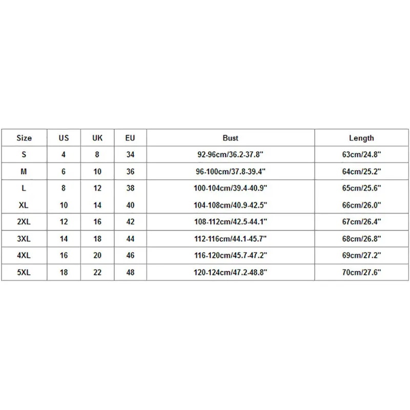 | Размер: 5XL | США: 18 | Великобритания: 22 | ЕС: 48 | Бюст: 120-124 см/47,2-48,8" | Длина: 70 см/27,6" |