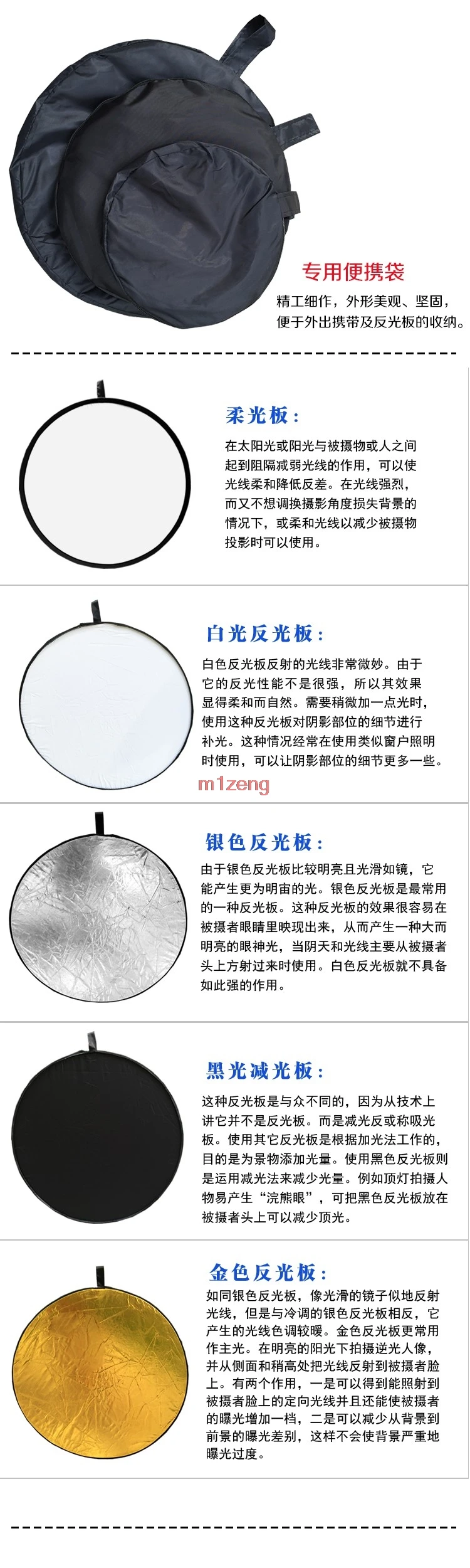 Полностью Складной и портативный Отражатель измеряет 110 см (43 ") в диаметре и выскакивает из его хранения/сумка для переноски, чтобы показать 5 различных отражающих поверхностей: