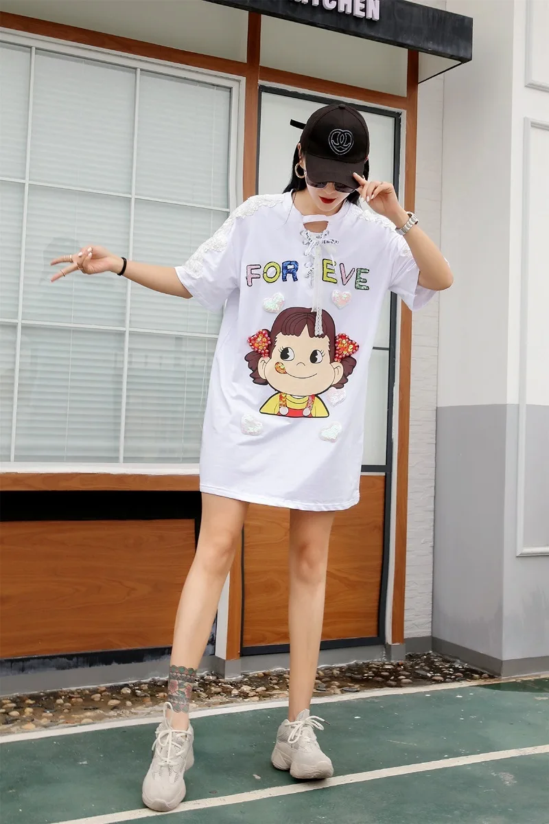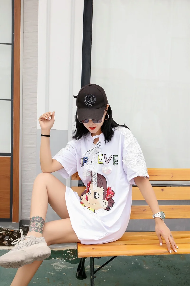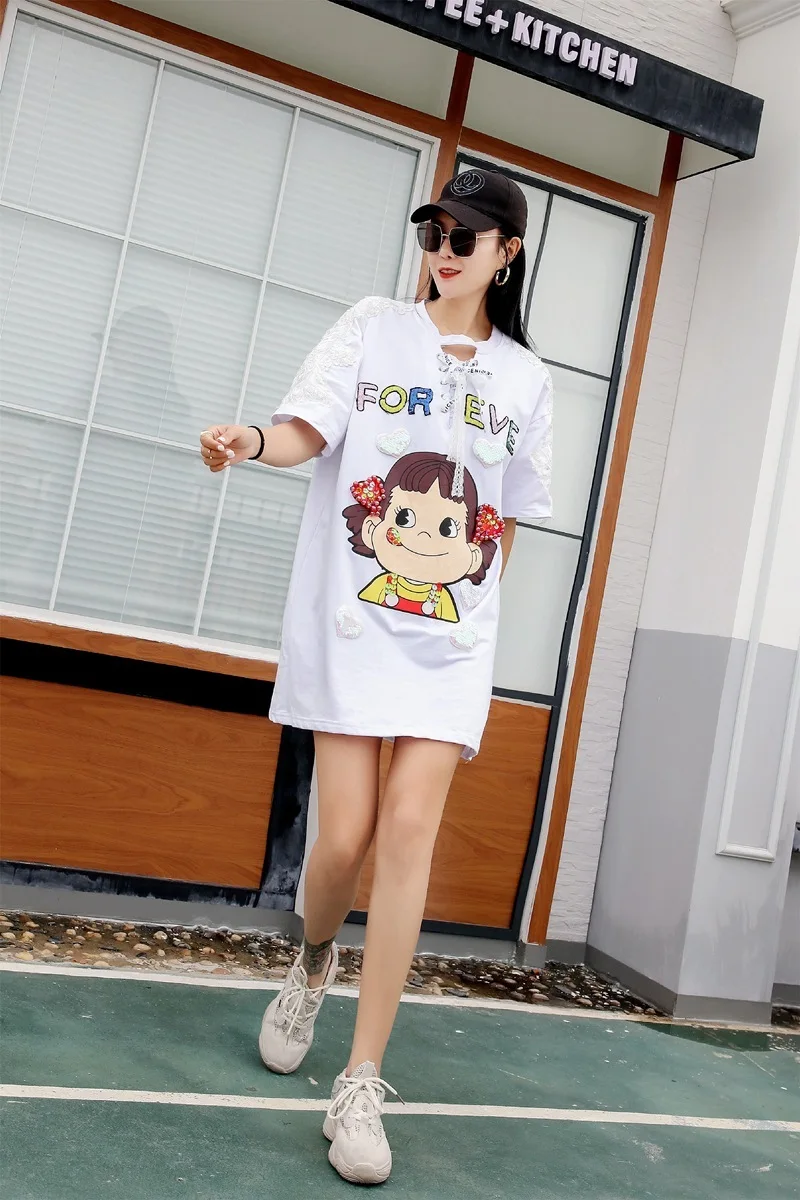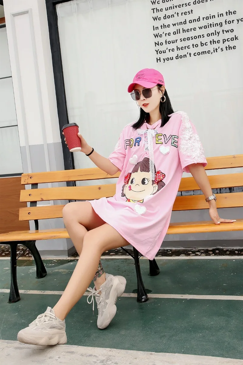 QING MO/женская футболка с принтом героев мультфильмов, украшенная бантом, летняя футболка розового, черного, белого цвета с короткими рукавами, ZQY045