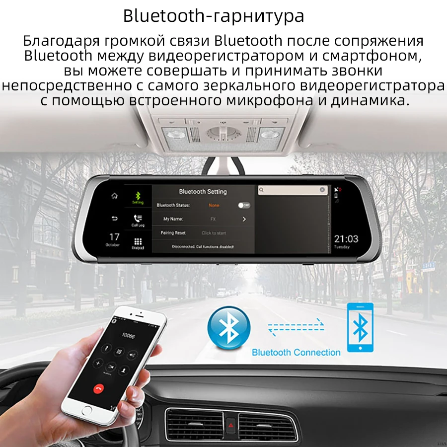 После сопряжения bluetooth между видеорегистратором и смартфоном вы можете совершать и принимать звонки непосредственно с зеркального видеорегистратора со встроенным микрофоном и динамиком.