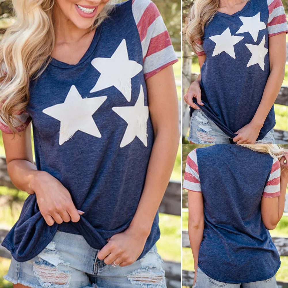 Женские сандалии Повседневное Отечественной американский флаг, звезды с принтом блуза с коротким рукавом, Топ