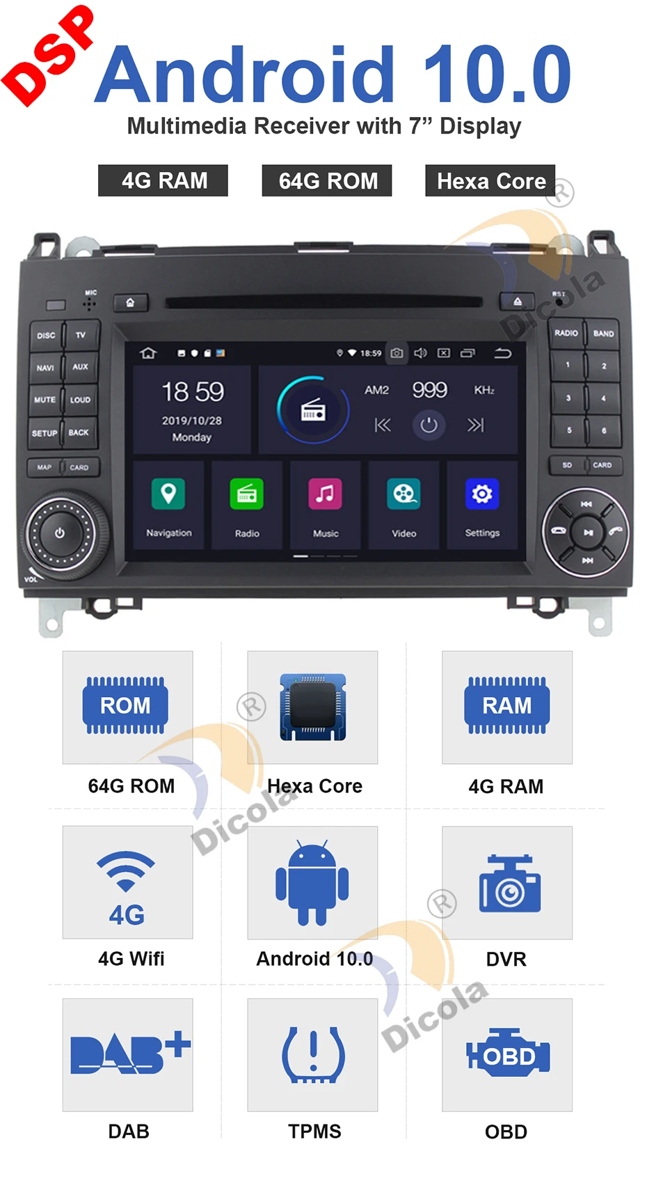 Чистый Android 10!DSP!7InchCar dvd-плеер для Mercedes Benz A/B Class/Vito/Viano/W169/w245с рулевым управлением +Шестиядерный процессор+4 Гб оперативной памяти+64 Гб ROM+1024*600 IPS HDЭкран + емкостный экран + Wifi +3G/4G(3G/4G ключ опционально)+ Gps-навигация +IPhone/Android мобильный телефон зеркальная ссылка+ Bluetooth 5,0 (A2DP/Телефонная книга) + FM/AM + RDS +Видеорегистратор (опционально)+OBD II (опционально)+1080P Vedio Play+DAB (опционально)+Автомобильная игра (опционально)+Дополнительный микрофон+Бесплатная карта+Камера заднего вида+Инструменты для ремонта