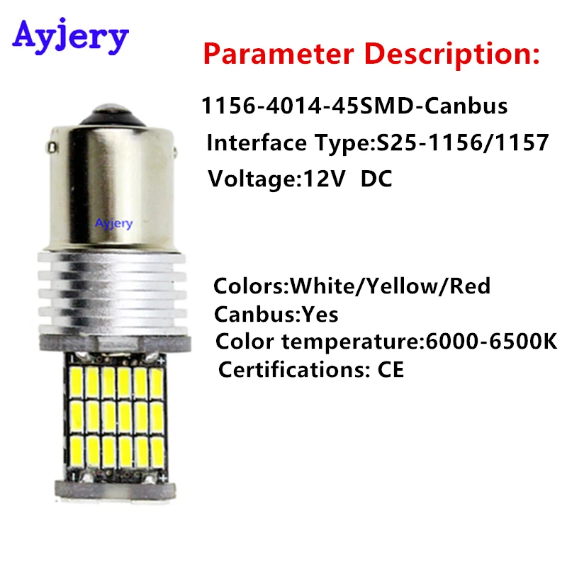 * Светодиодный Тип: 4014 45SMD* Вход: 12 В постоянного тока* Люмен: 680лм* Мощность: 2,88 Вт* Inpute мощность: 12 В @ 0.24A (2,88 Вт)* Цветовая температура: 6000-8000K* Цвет: супер белый/желтый/красный* Размер (прибл.):53 мм x 16 мм x 14 мм* Вес: 0,0122 кг/шт.* Срок службы: 20000 рабочих часов* Стандарты и сертификаты: CE/FCC/ROHSПримечание:Применение транспортного средства:Поворотные сигнальные огни/парковочные огни/дневные ходовые огни (DRL)/тормозные огни/Задние задние фонариЗаменяет запасную лампу:1156 BA15S Sockel (P21W):1073 1095 1141 1156 1156A 1156NA 1195 12088 1295 1295NA 199 2396 3497 631 7506 9397 97A 97NA1157 BAY15D заменяет склад лампы: 1016 1034 1142 1157 1157A 1178A 1196 2057 2057A 2357 2357A 2357NA 2397 3496 7528 94Посылка включает в себя:10 шт./лот 1156/11574014 45smdСветодиодный светильникПримечание: Перед заказом убедитесь, что лампы соответствуют вашим автомобилям. Спасибо!
