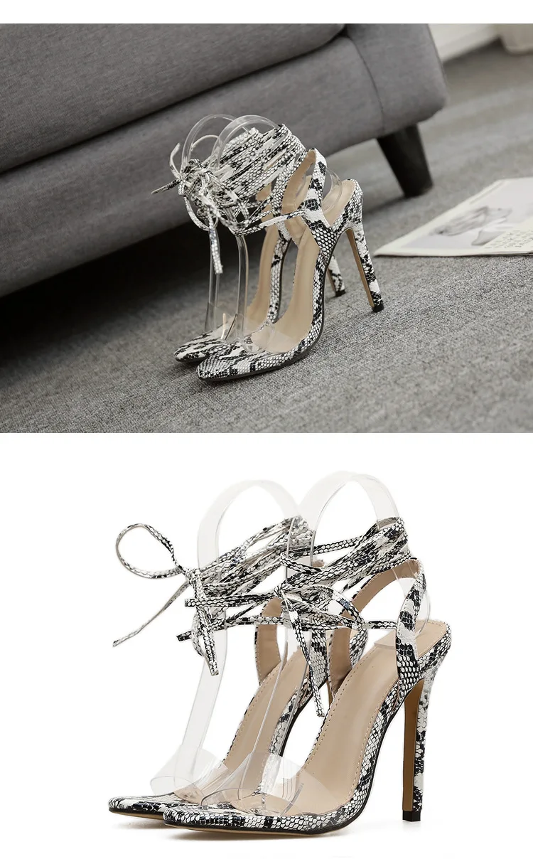 Пикантные женские туфли-лодочки на высоком каблуке; Летняя женская обувь; Прозрачная обувь; Женские босоножки; Вечерние женские босоножки со шнуровкой и змеиным узором