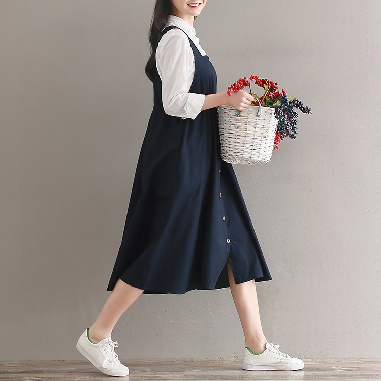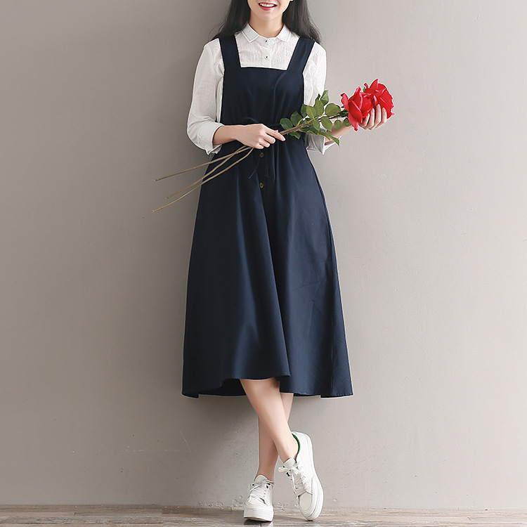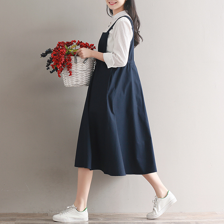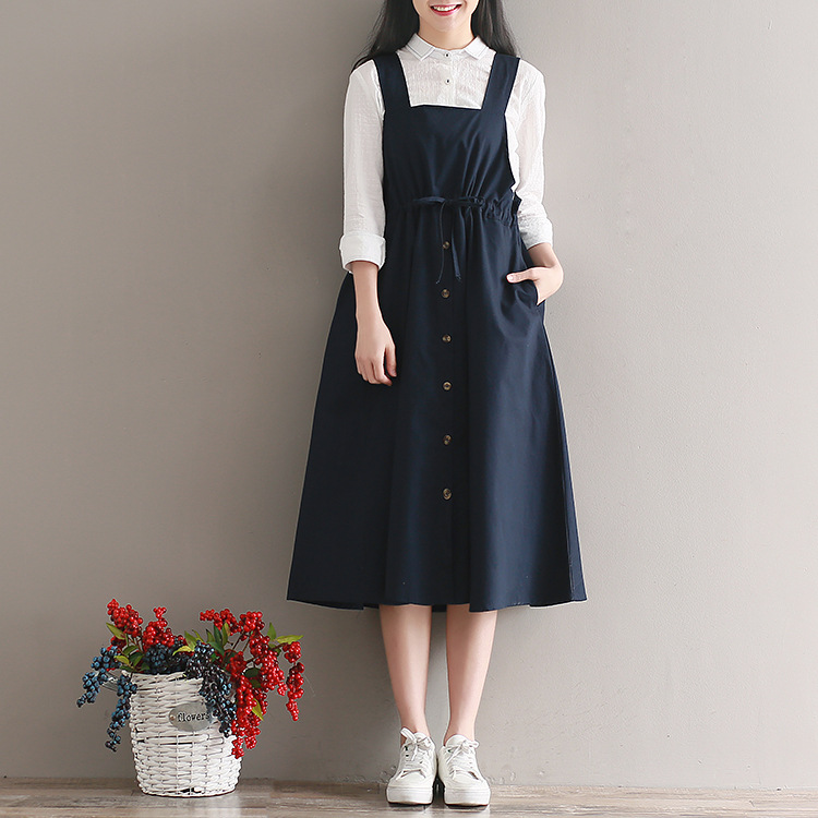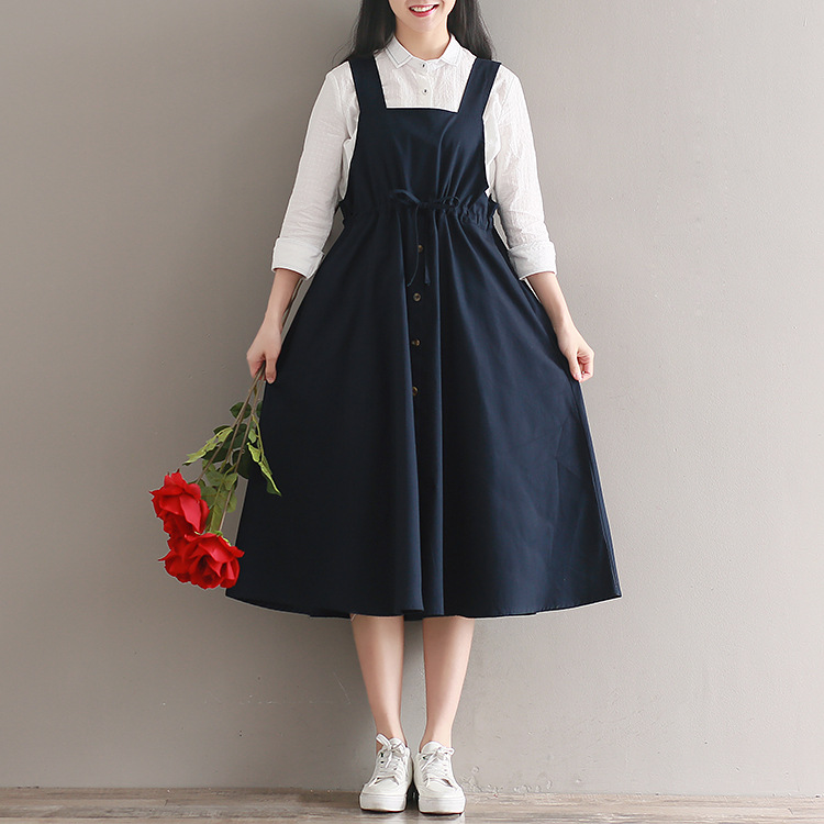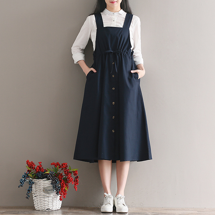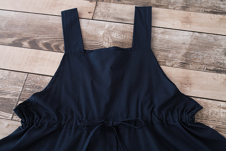 Японский Mori Girl Летний женский сарафан темно-синий подтяжки элегантное платье из хлопка и льна винтажные платья миди без рукавов