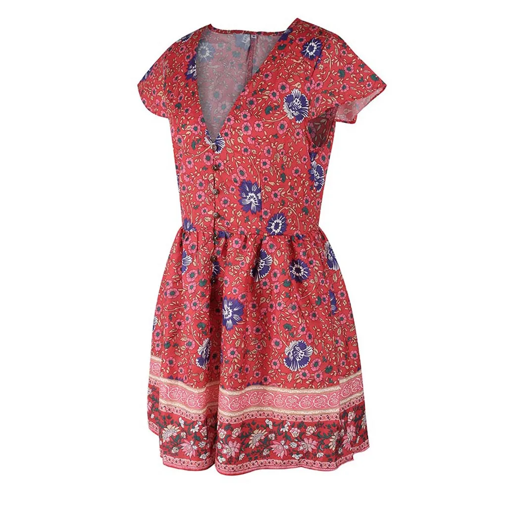 Женское богемное платье для отдыха на пляже, мини-платье на пуговицах с цветочным принтом и оборками, вечерние платья с v-образным вырезом, новинка 2019
