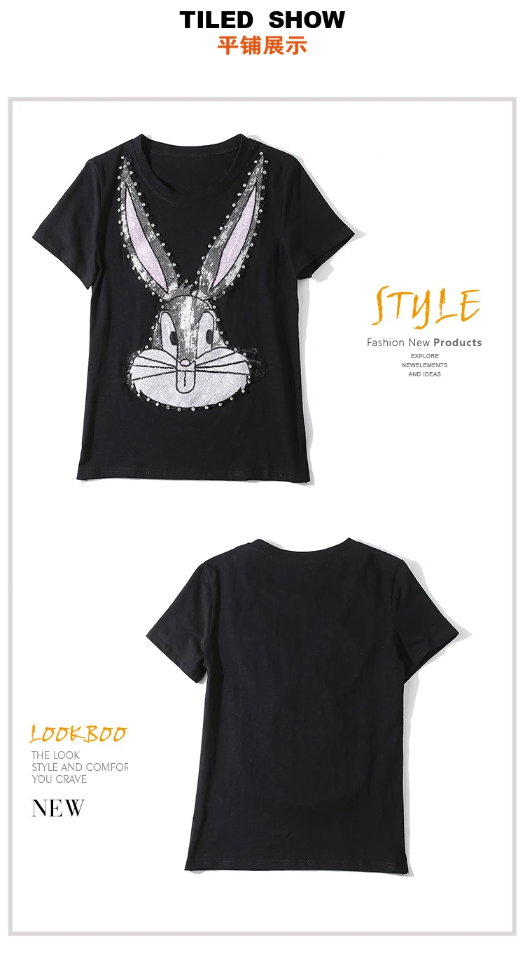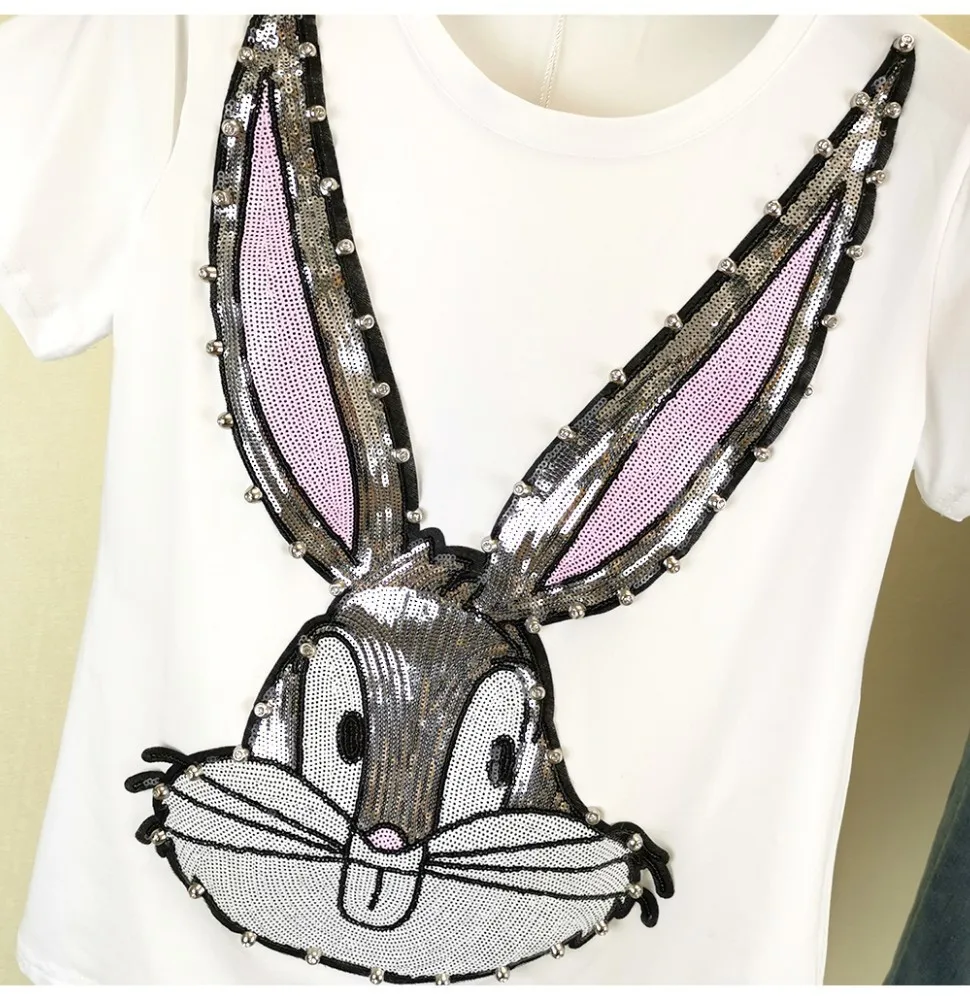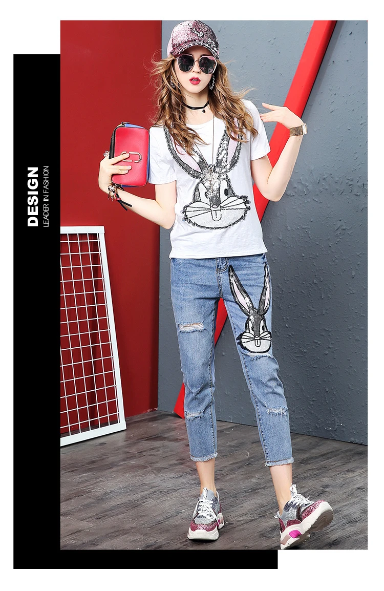Летние женский комплект 2 шт. расшитые бисером с кроликом блестками футболки +