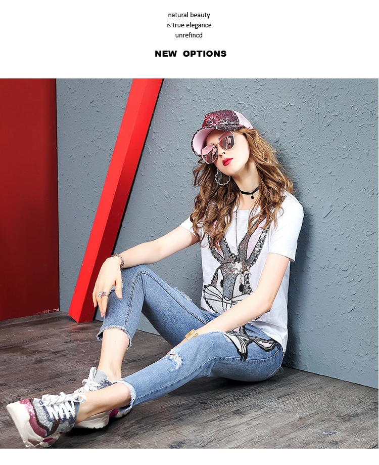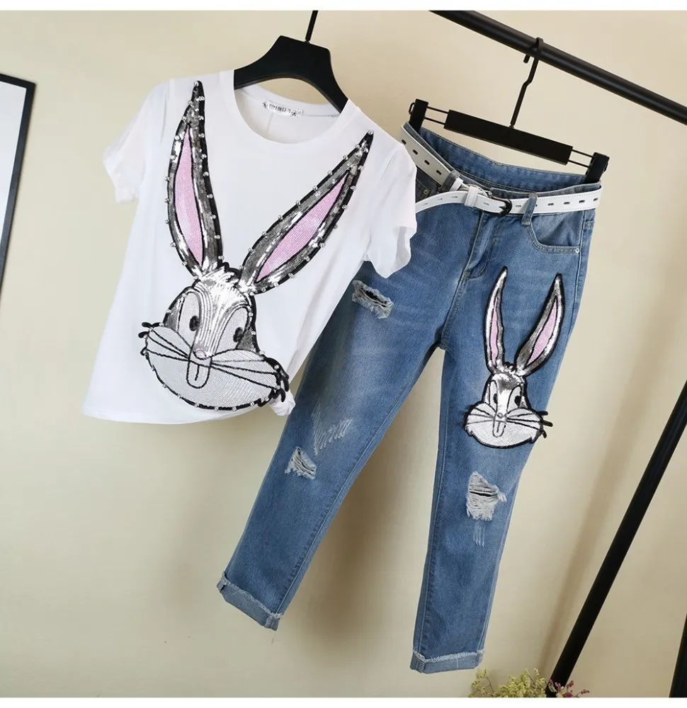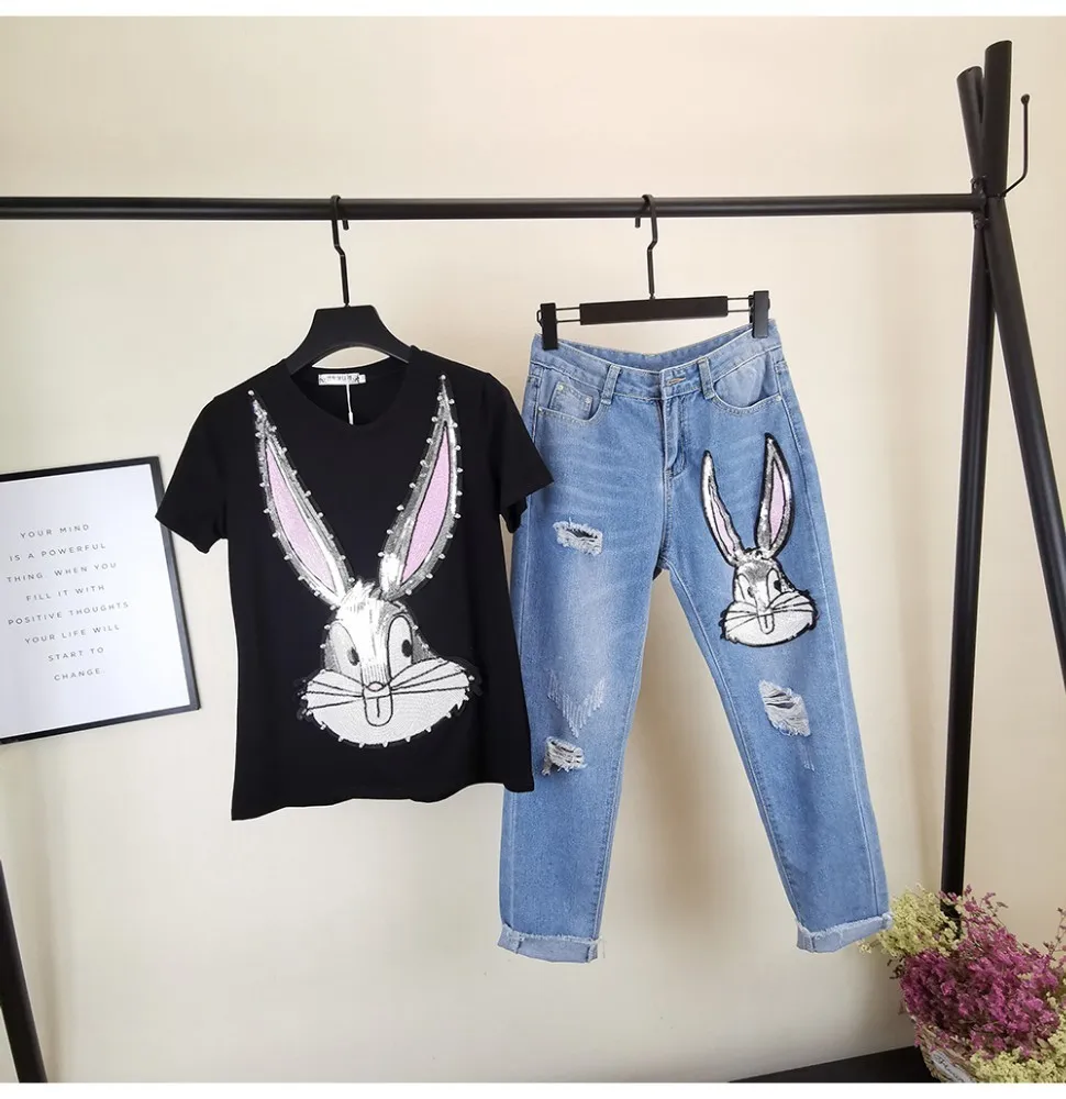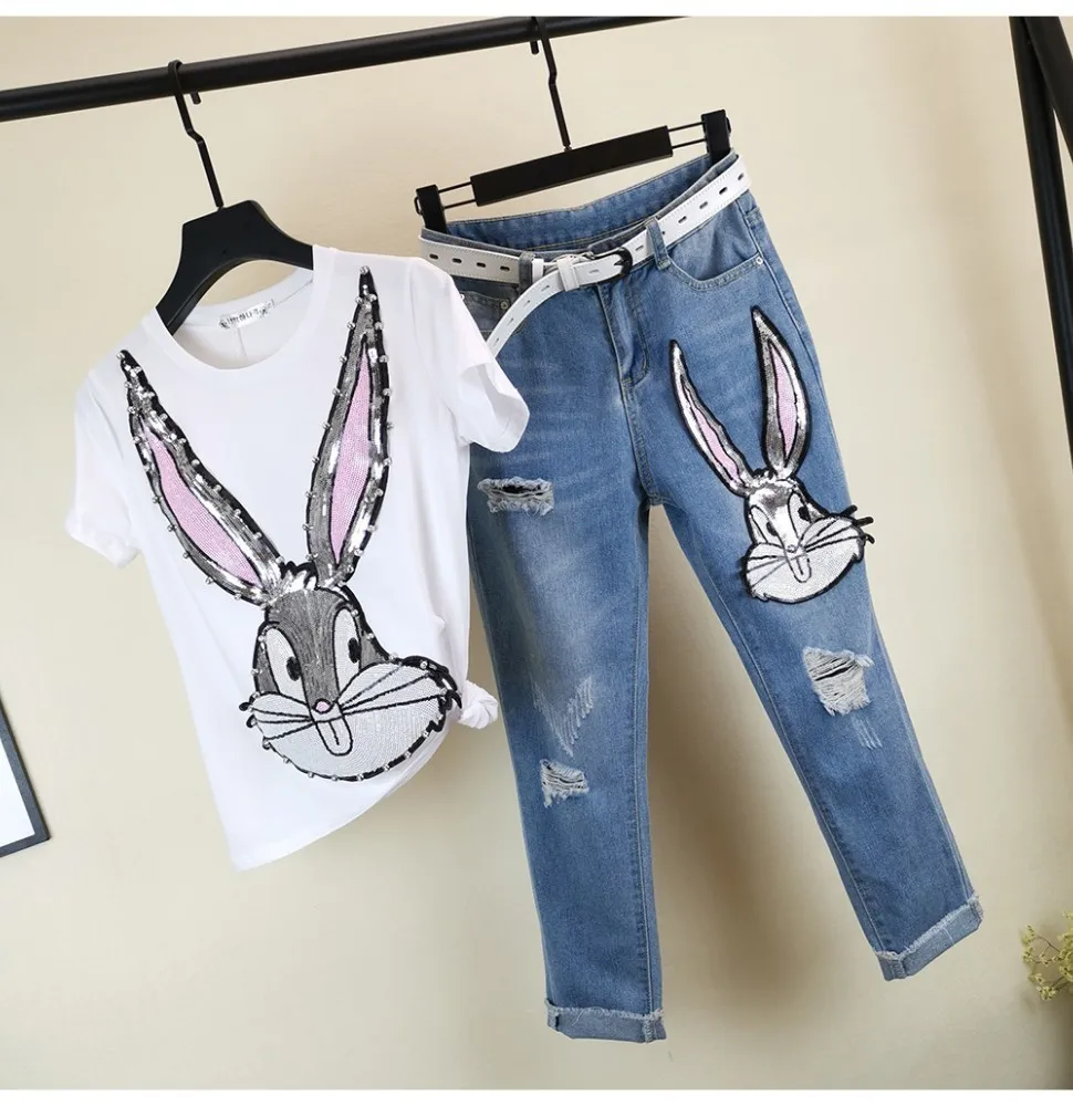 Летние женский комплект 2 шт. расшитые бисером с кроликом блестками футболки +